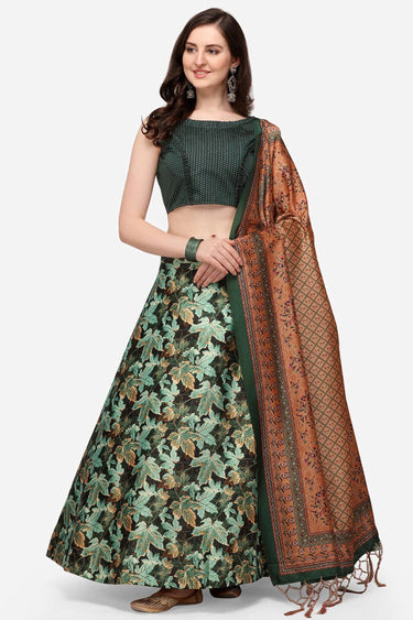 Tempting Satin Silk Fabric Green Color Lehenga With Printed Work