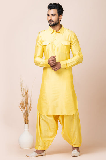 Traditional Viscose Fabric Pathani Kurta Pyjama Set In Yellow Color