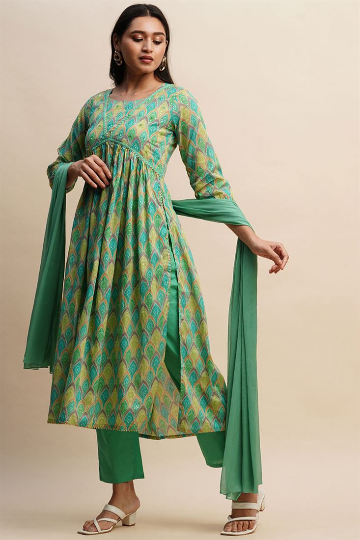 Trendy Casual Sea Green Color Salwar Suit in Cotton with Eye Catching Prints