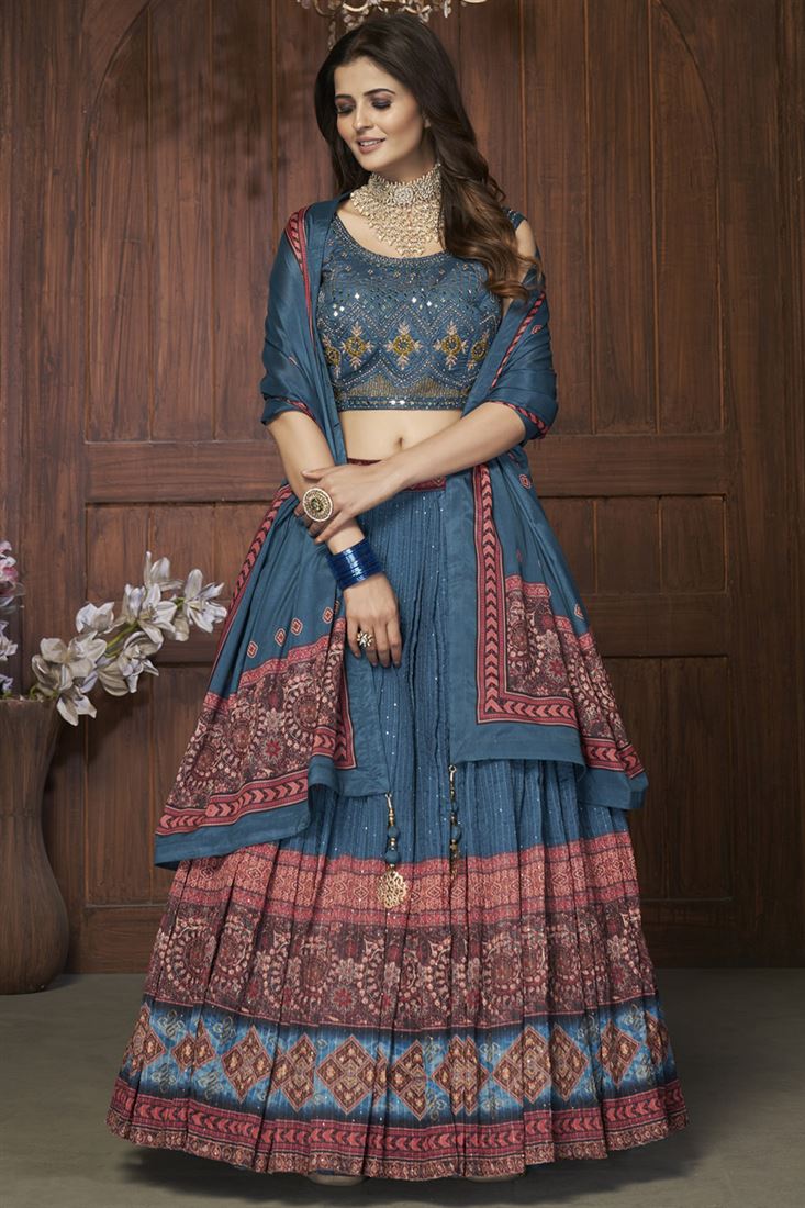 Trendy Sangeet Wear Chinon Fabric Blue Color Lehenga With Sequins Work