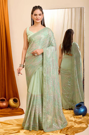 Trendy Sequins Work On Sea Green Color Saree In Georgette Fabric