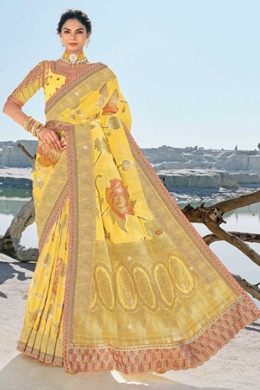 Trendy Silk Fabric Yellow Color Wedding Wear Saree