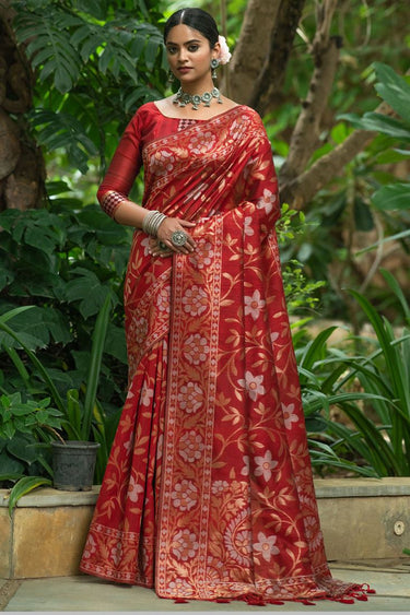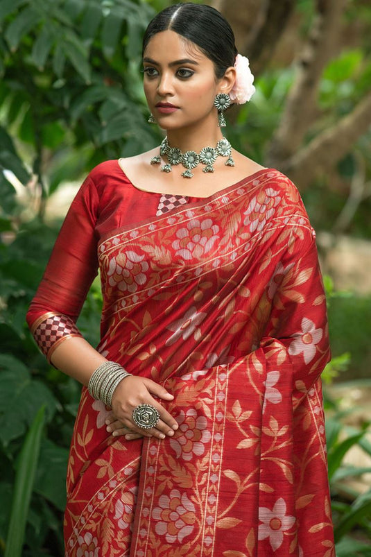 Tussar Silk Woven Saree In Red Colour