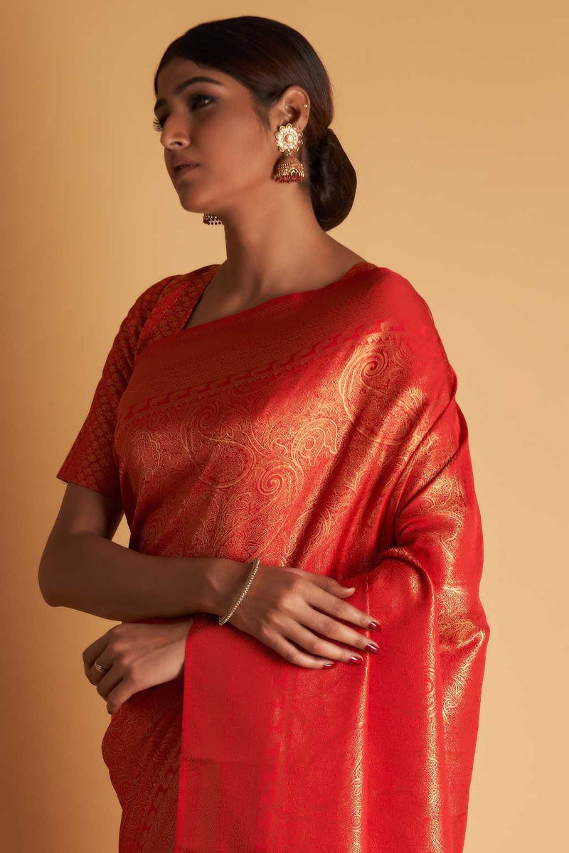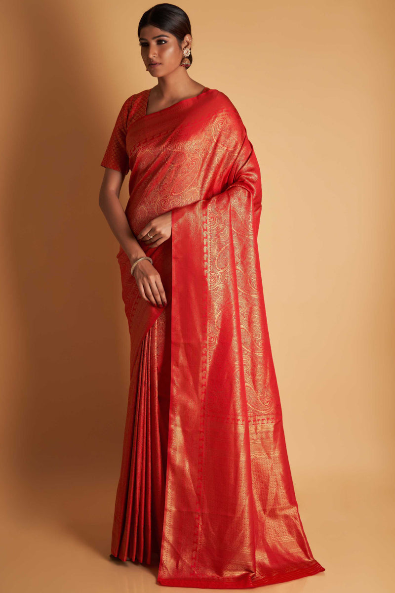 Two Tone Kanjivaram Silk Fabric Sangeet Wear Red Weaving Work Saree