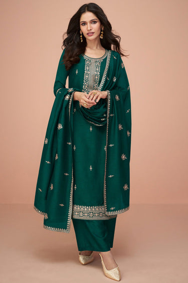Vartika Singh Dark Green Color Embroidered Work On Art Silk Fabric Beatific Palazzo Suits