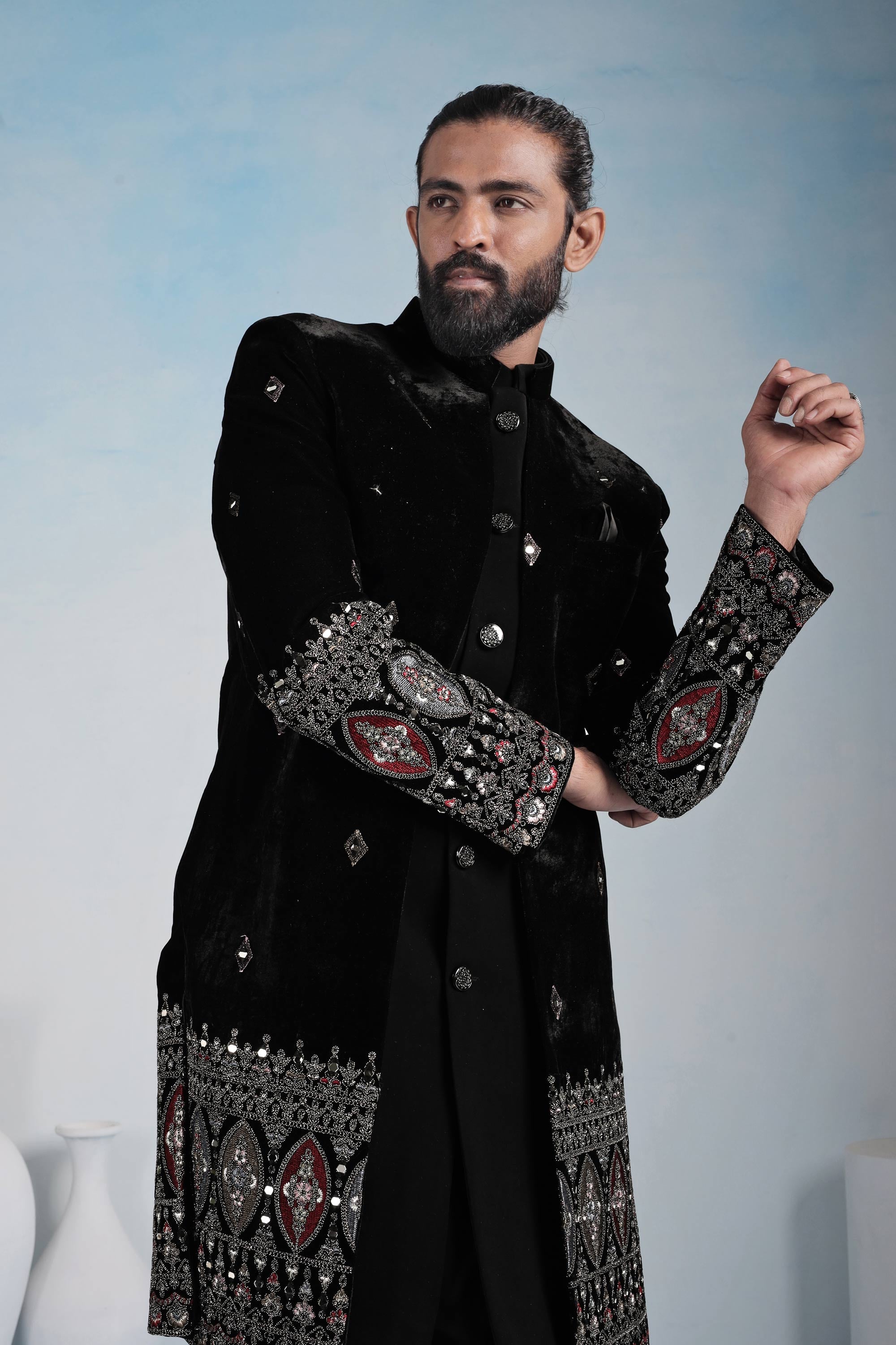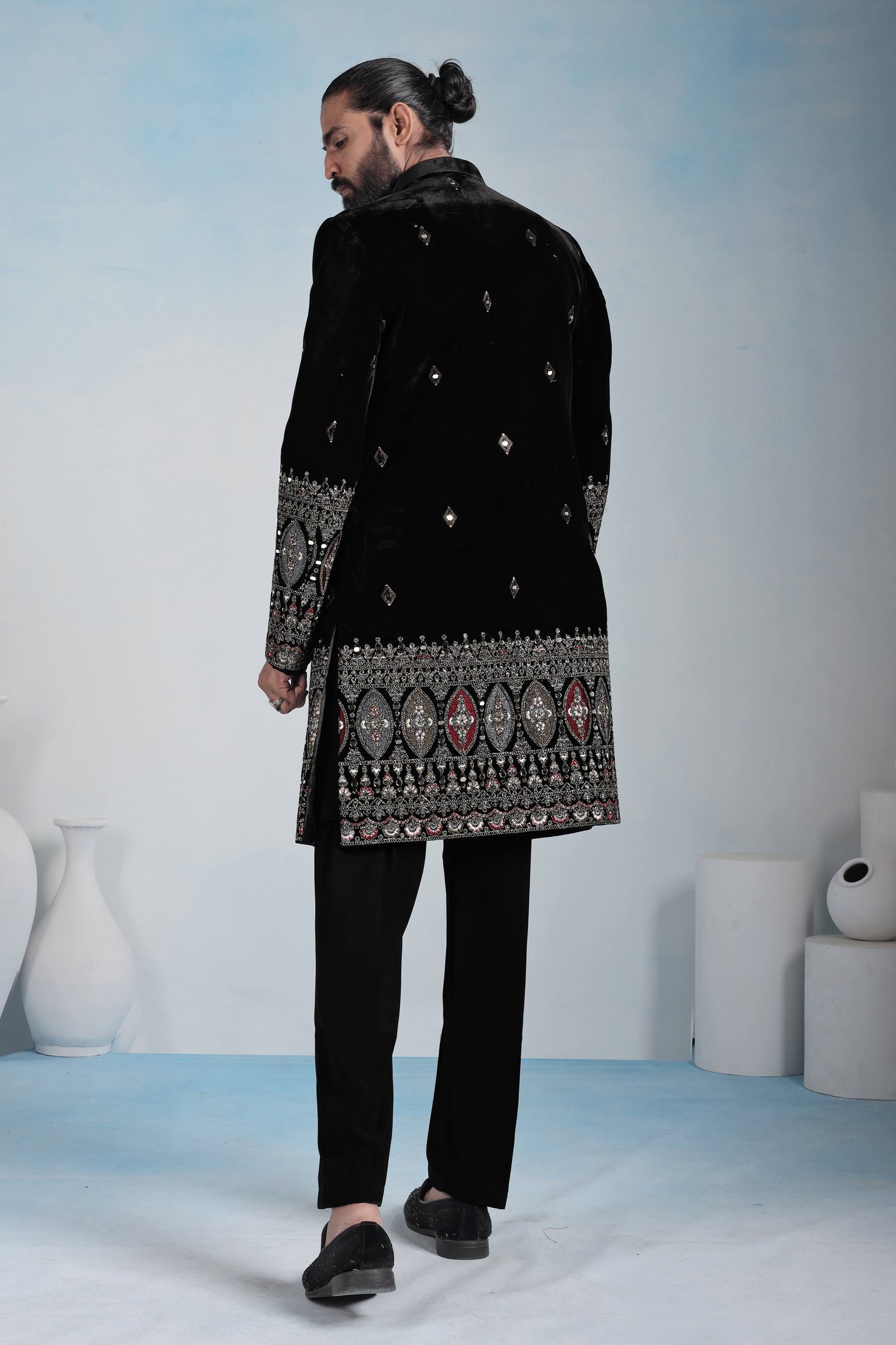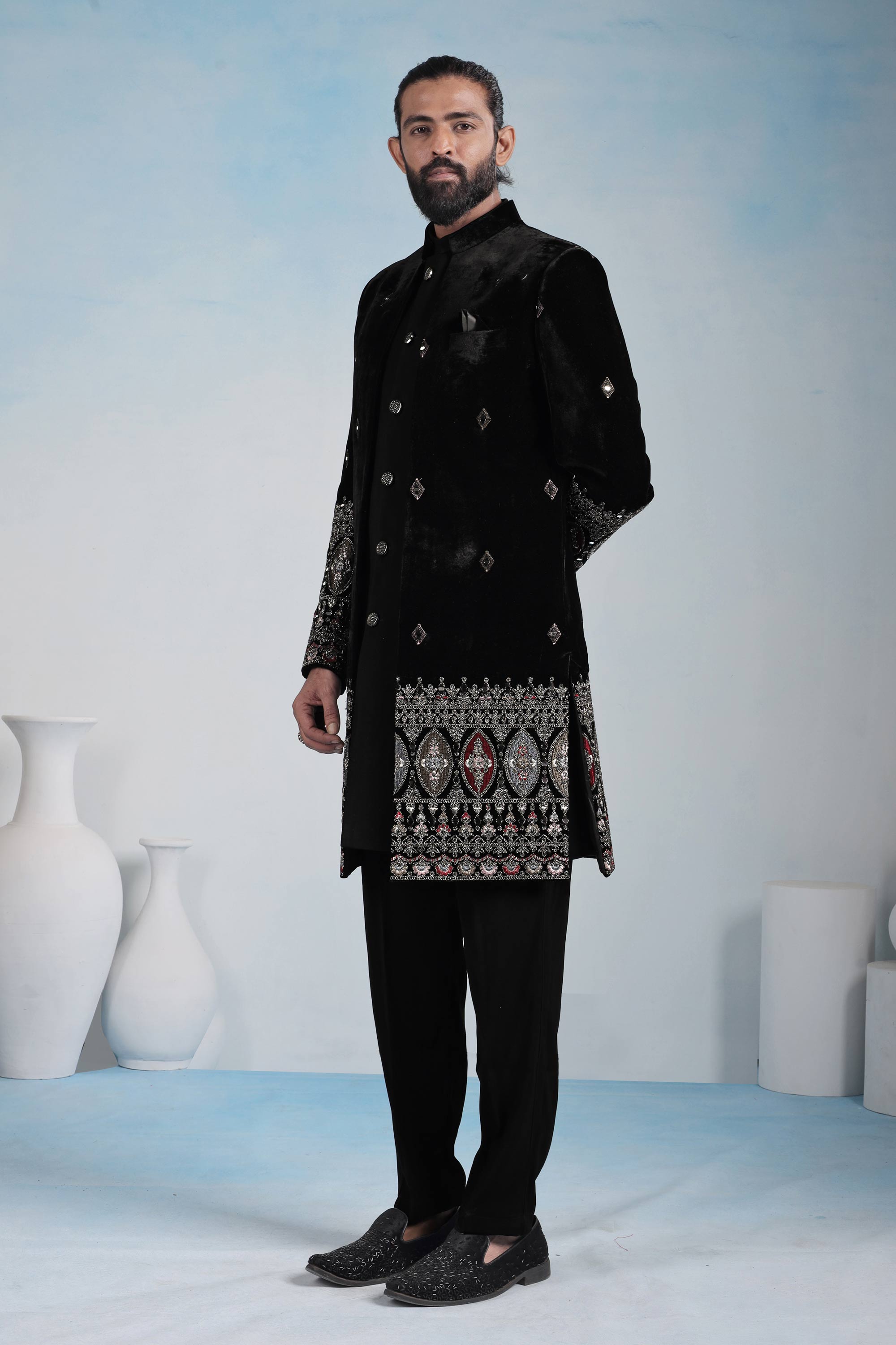 Velvet Black Embroidered Men Readymade Indo Western For Wedding Wear