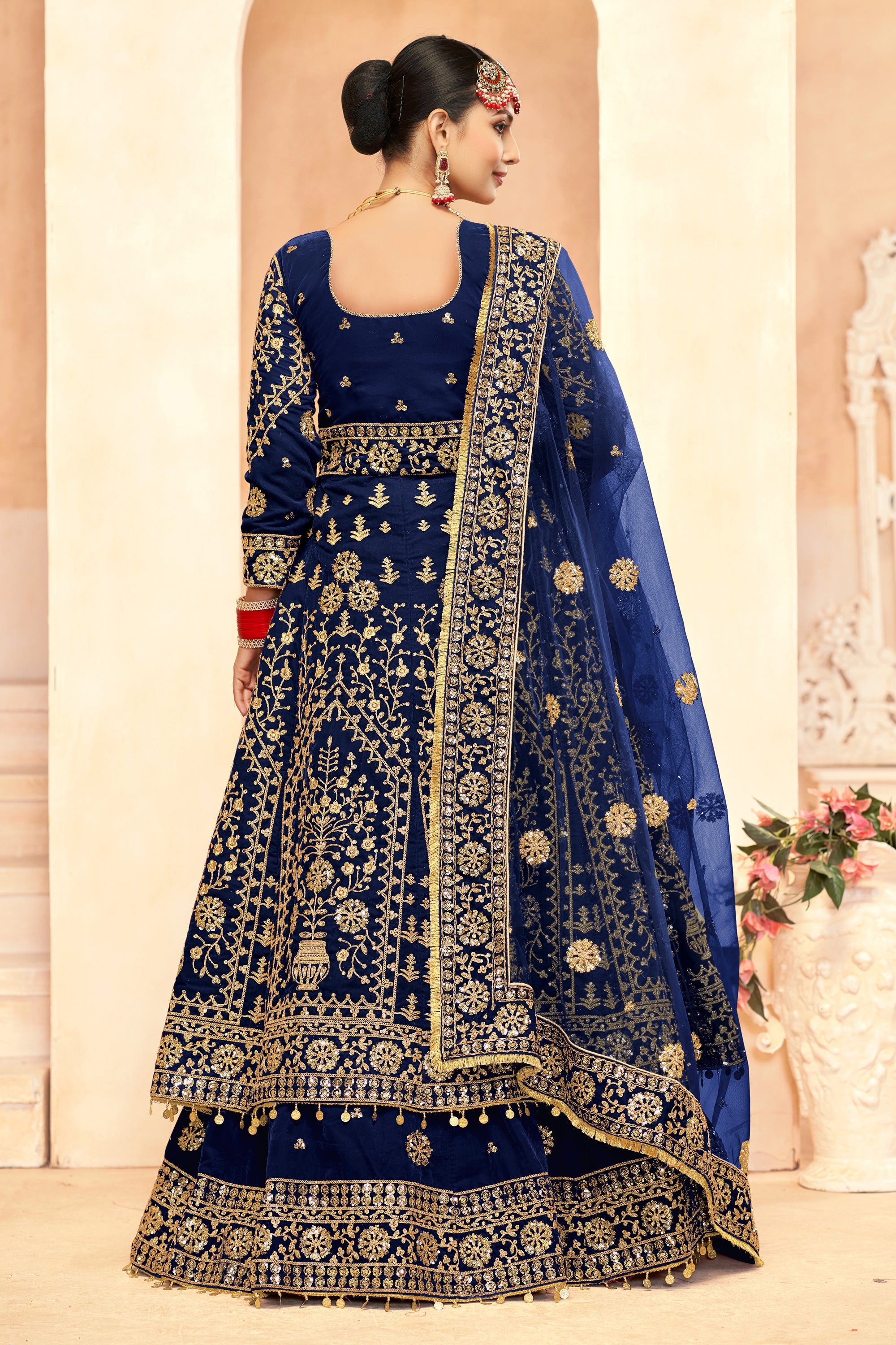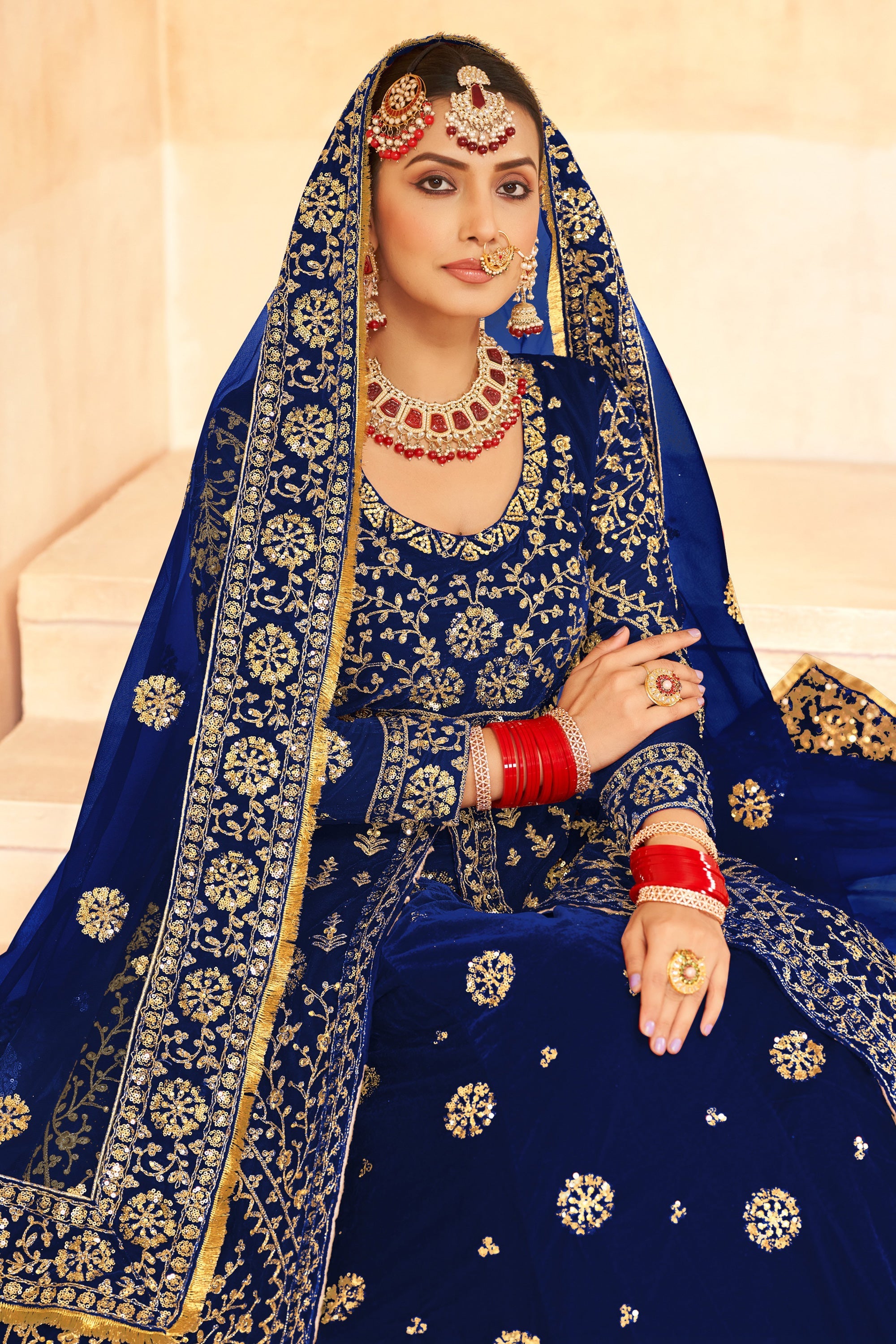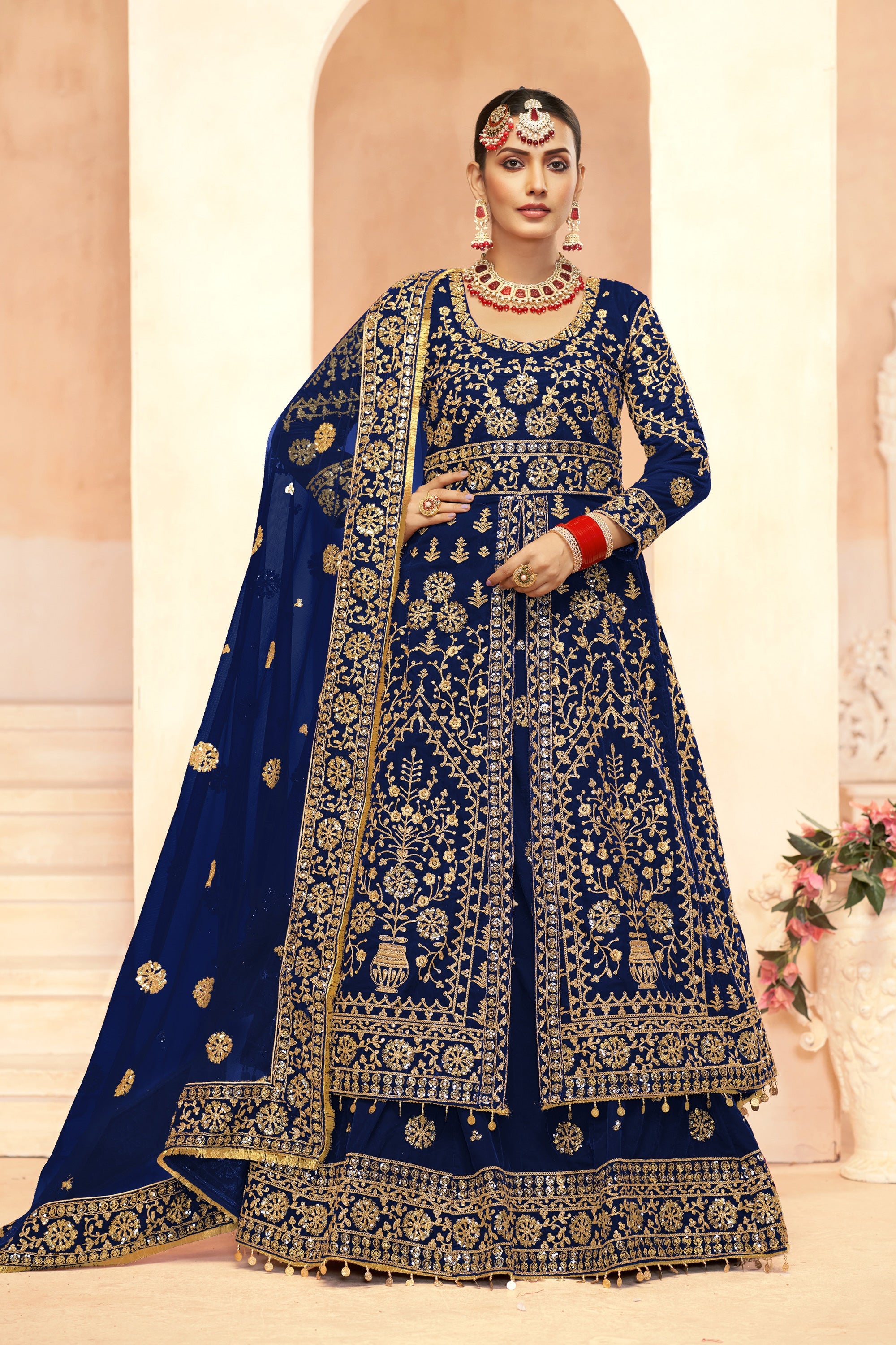 Velvet Blue Sangeet Wear Embroidered Sharara Top Lehenga