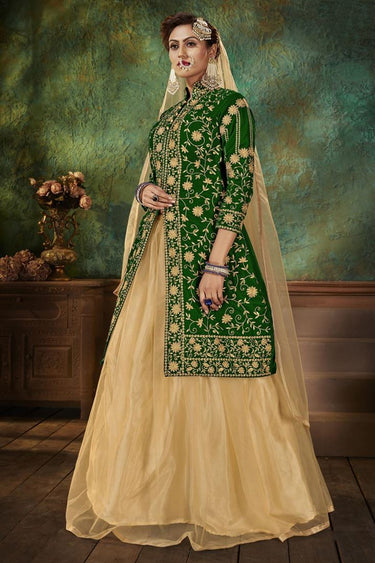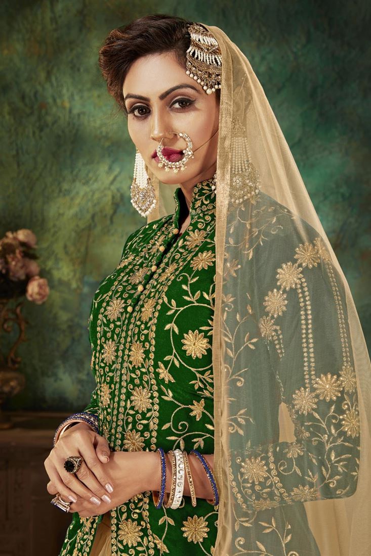 Velvet Fabric Fancy Sangeet Wear Green Embroidered Sharara Top Lehenga