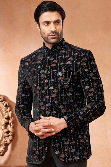 Velvet Stunning Black Color Wedding Wear Readymade Men Jodhpuri Jacket