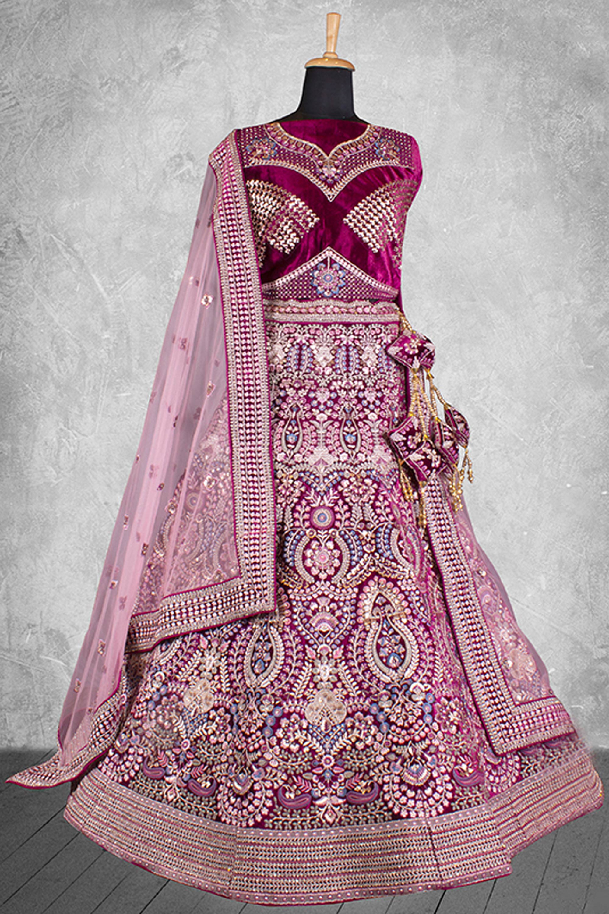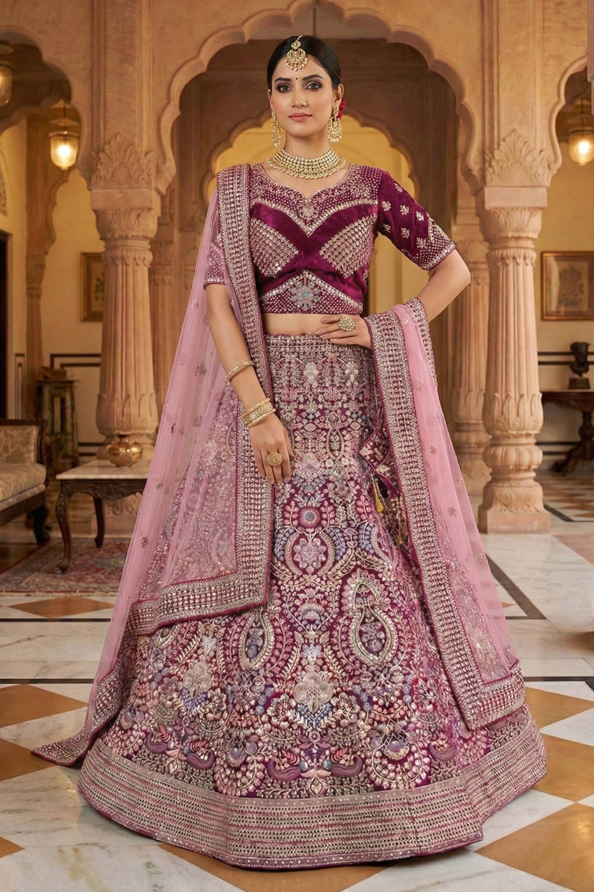 Velvet Wine Velvet Fabric Embroidered Bridal Lehenga Choli