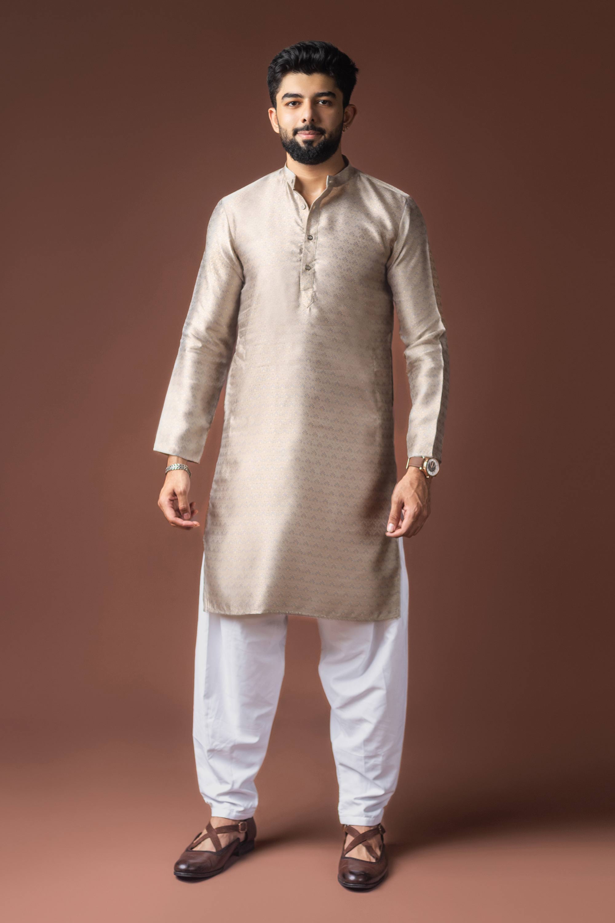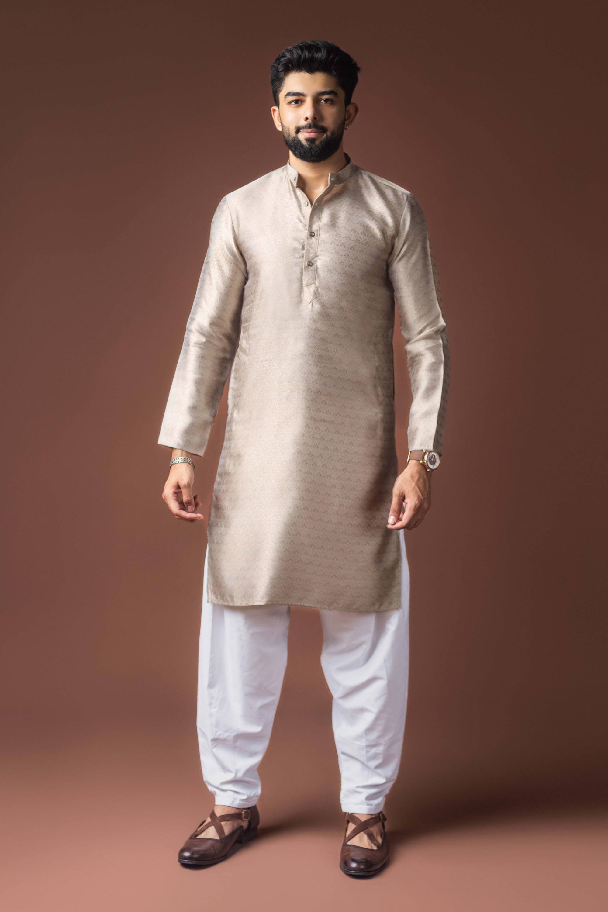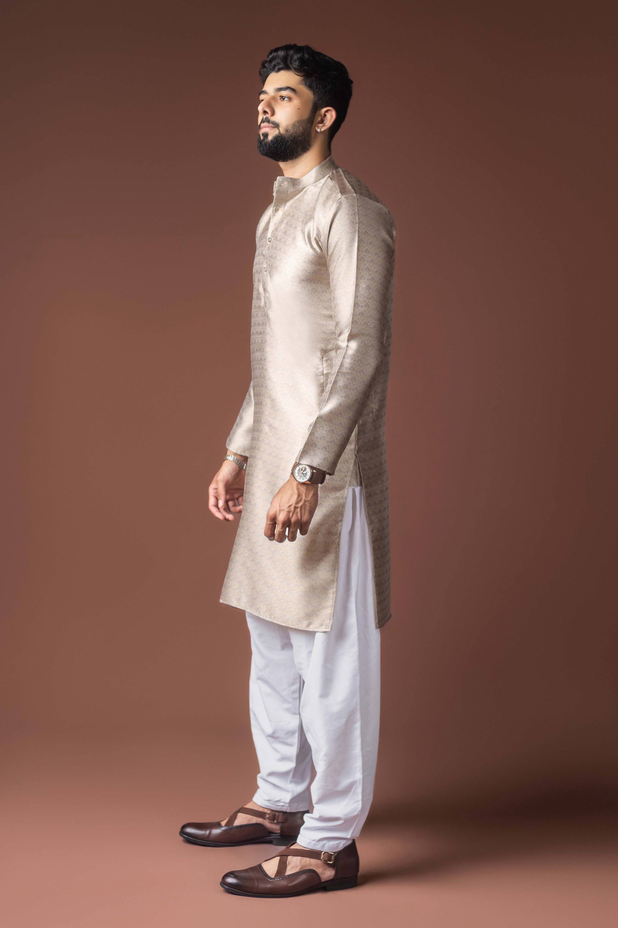 Weaving Work Beige Jacquard Wedding Wear Readymade Kurta For Men