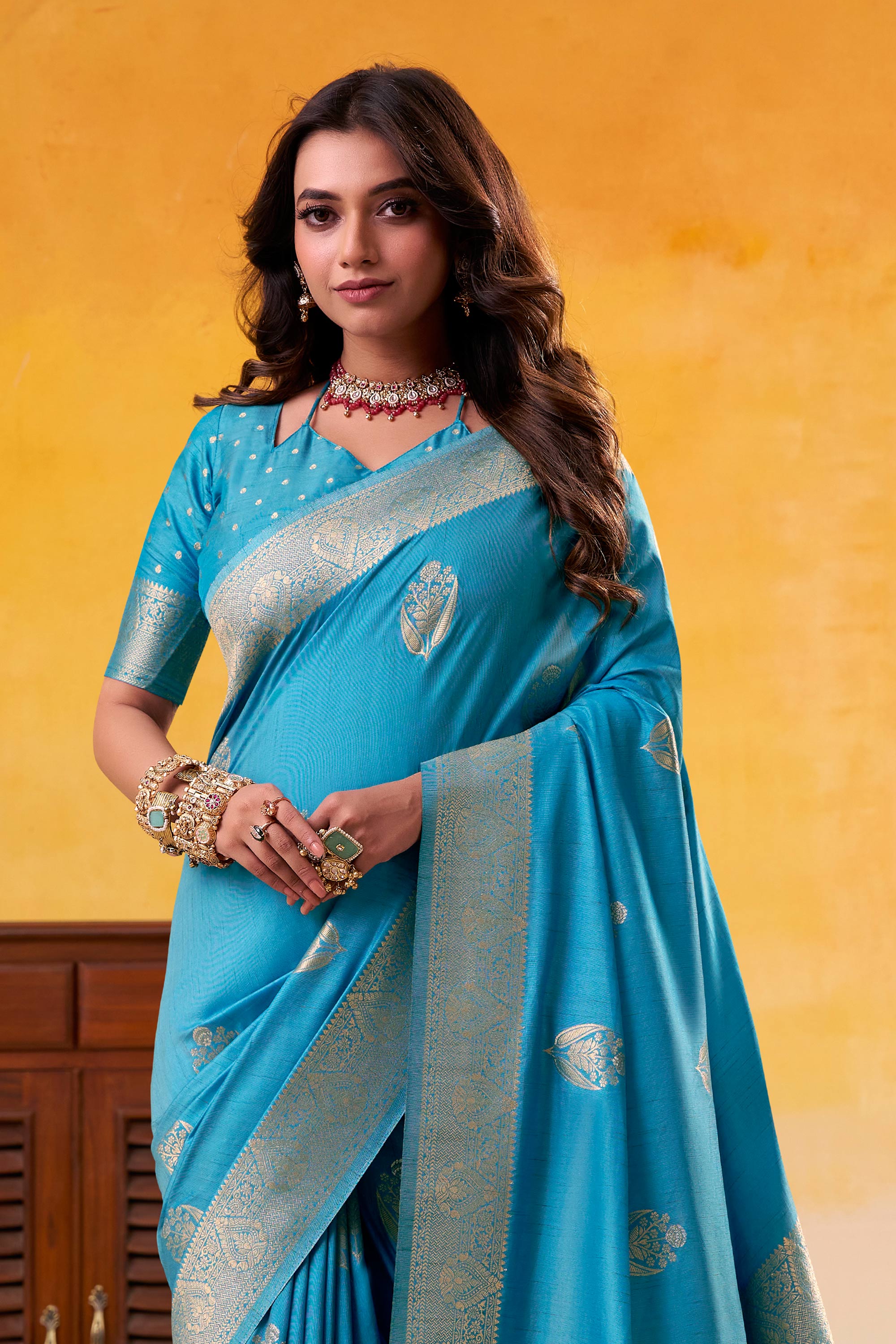 Weaving Work Cyan Art Silk Fabric Function Wear Saree
