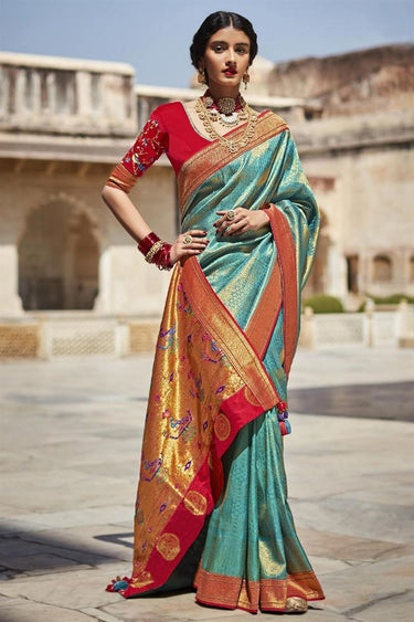 Weaving Work Cyan Color Art Silk Fabric Function Wear Mesmeric Saree