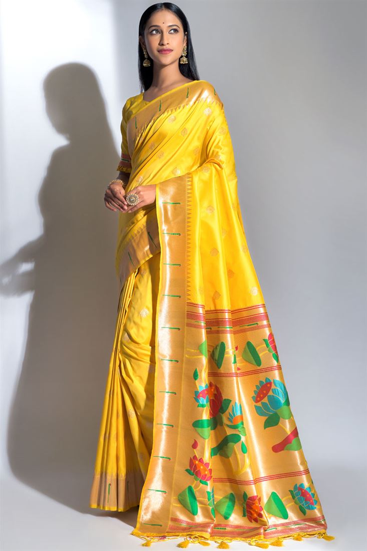 Weaving Work Paithani Silk Fabric Lovely Yellow Color Saree