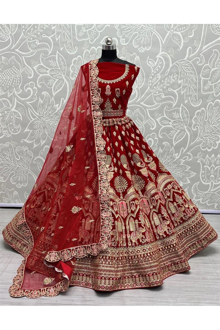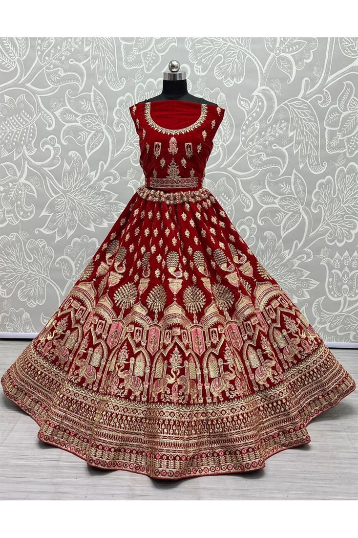 Wedding Look Velvet Fabric Red Color Riveting Bridal Lehenga