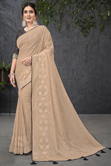 Wedding Wear Chikoo Color Embroidered Saree In Chiffon Fabric