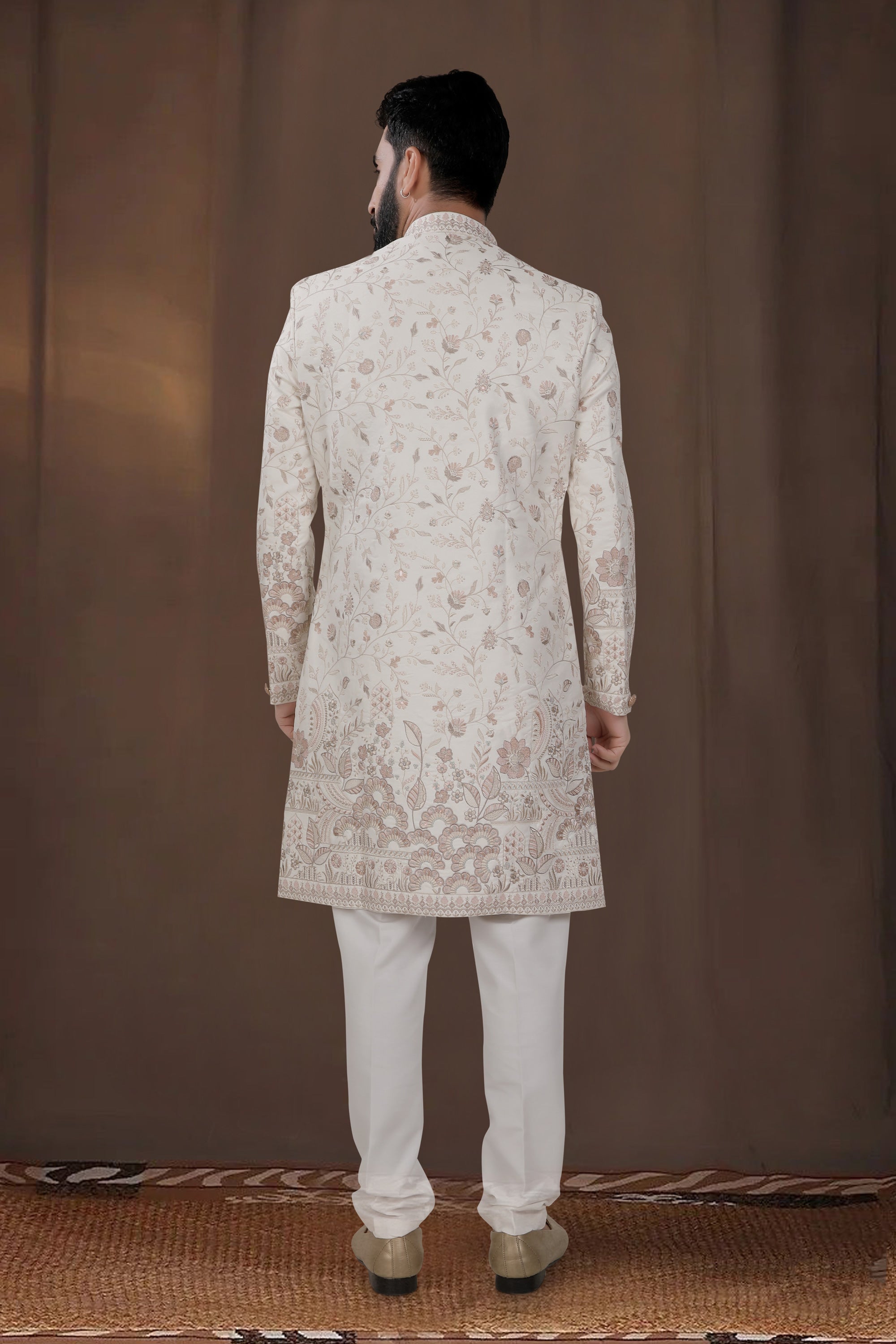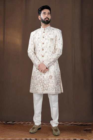 Wedding Wear Fancy Fabric Designer Readymade Indo Western For Men In Off White Color