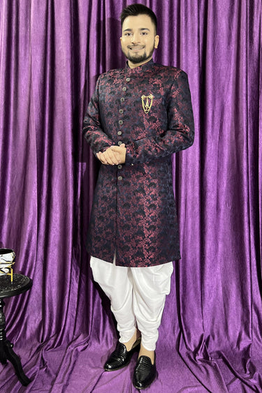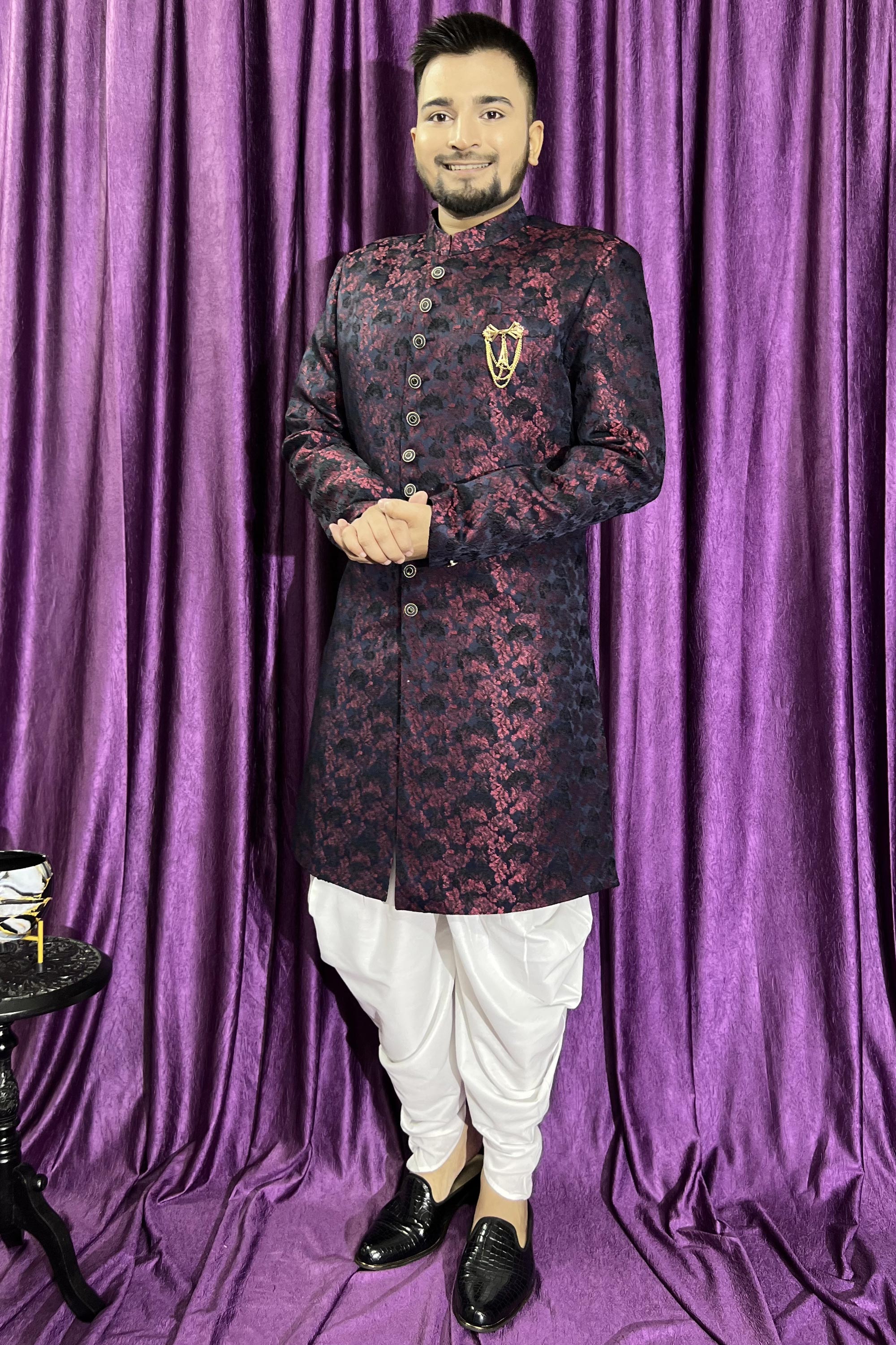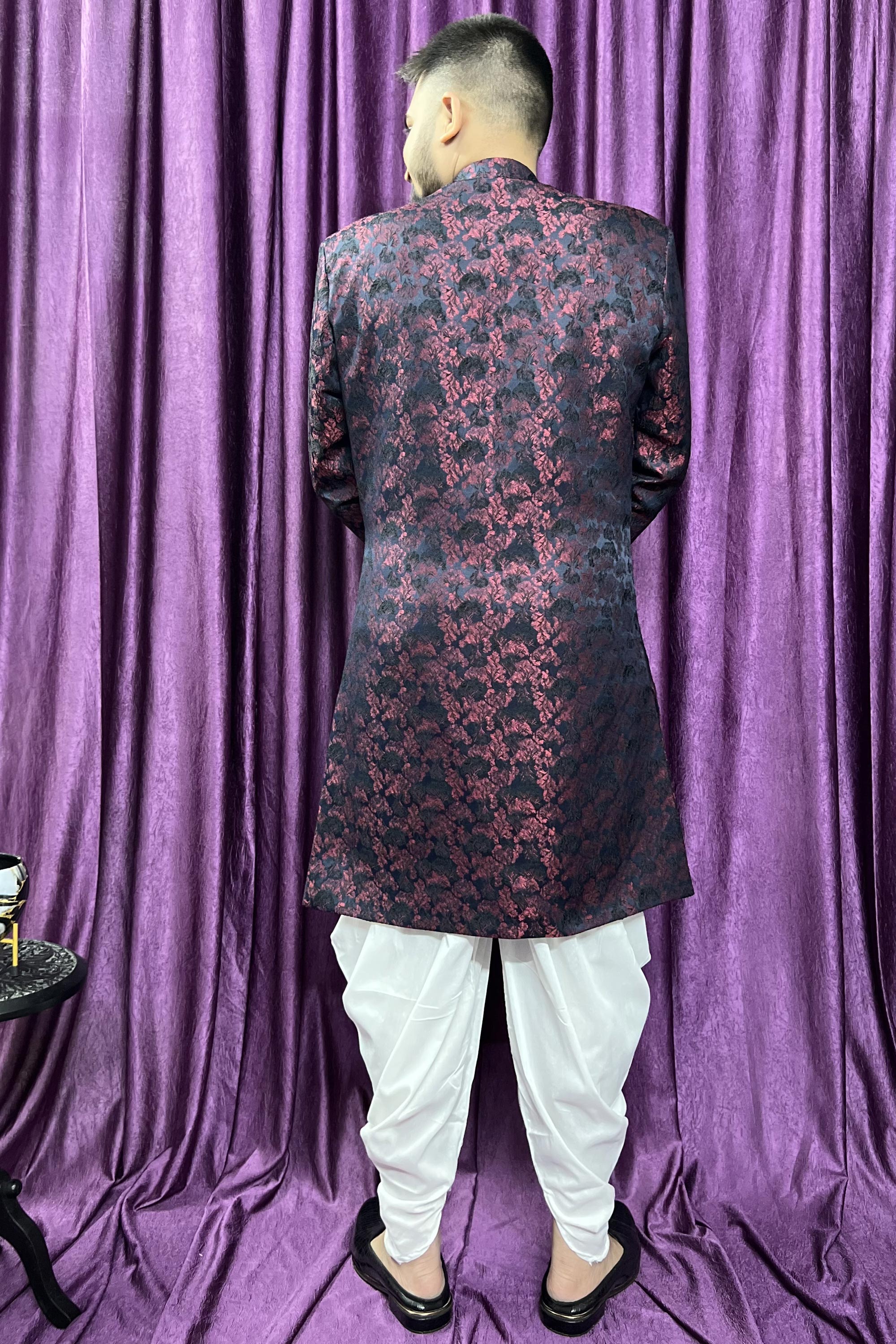 Wedding Wear Jacquard Fabric Readymade Maroon Color Peshawari Style Indo Western For Men