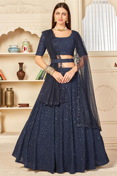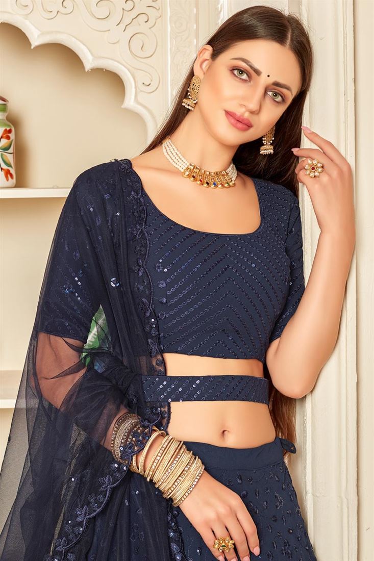 Wedding Wear Navy Blue Color Embroidered Lehenga Choli In Georgette Fabric