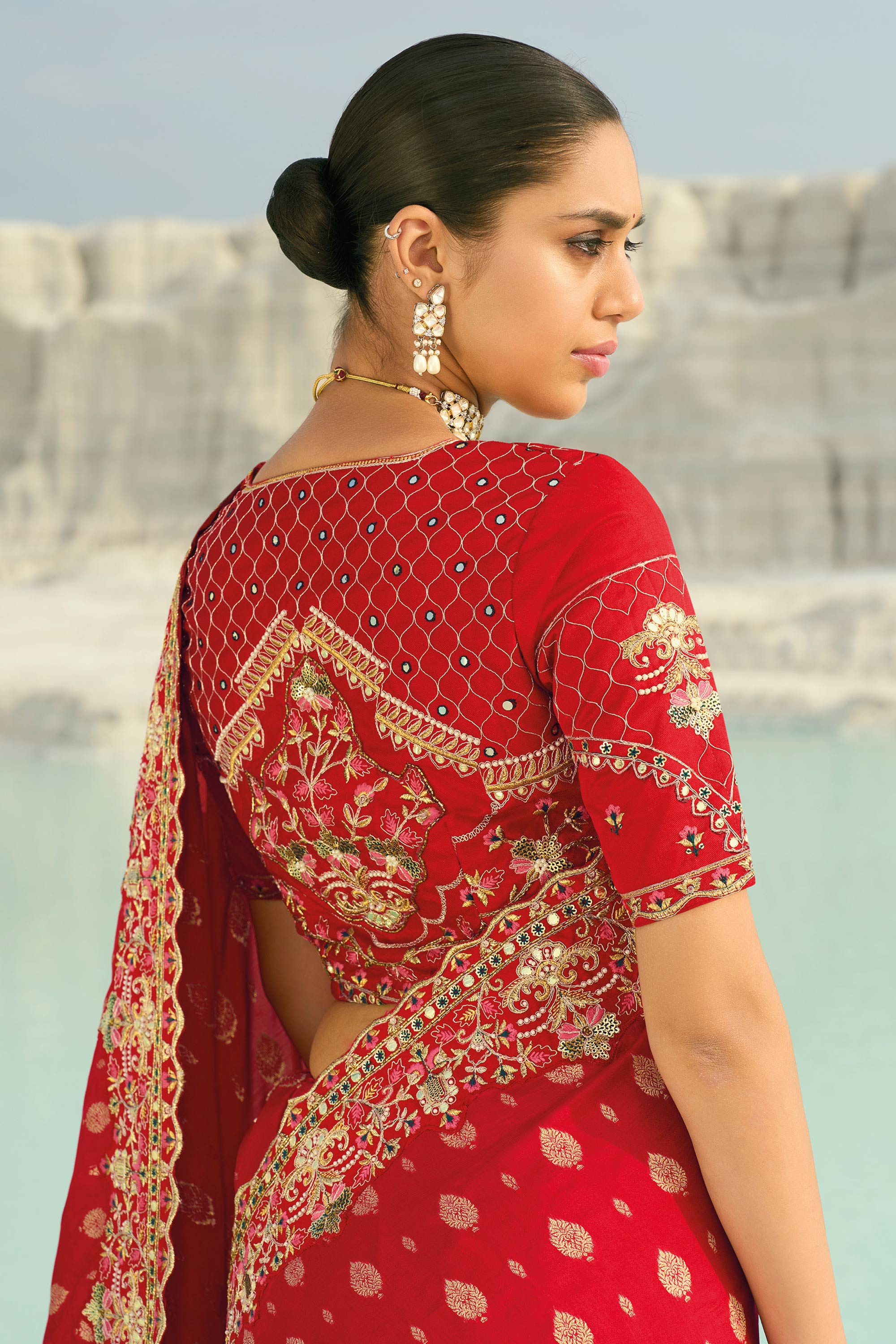 Wedding Wear Red Viscose Fancy Border Work Saree With Embroidered Blouse