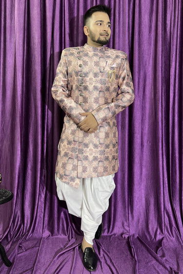 Wedding Wear Silk Fabric Designer Readymade Peshawari Style Indo Western For Men In Peach Color