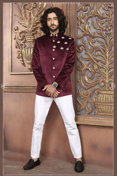 Wedding Wear Velvet Fabric Maroon Color Jodhpuri Suit