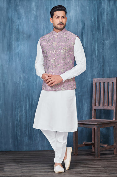 White Banarasi Silk Fabric Sangeet Wear Trendy Readymade Kurta Pyjama For Men With Jacket Set