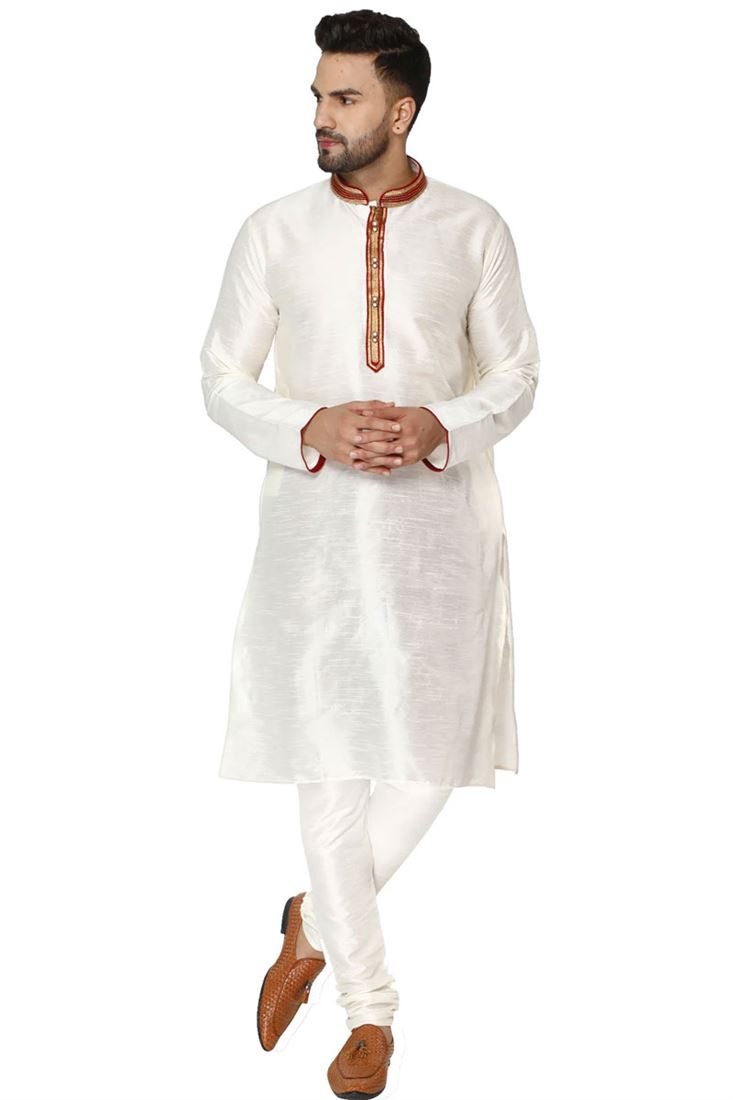 White Color Dhupion Silk Fabric Puja Wear Kurta Pyjama For Men