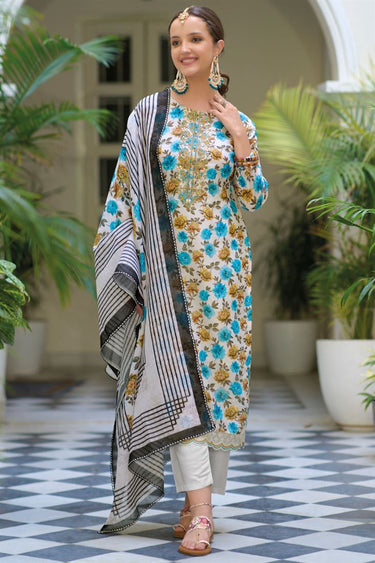 White Color Printed Winsome Linen Fabric Readymade Salwar Suit