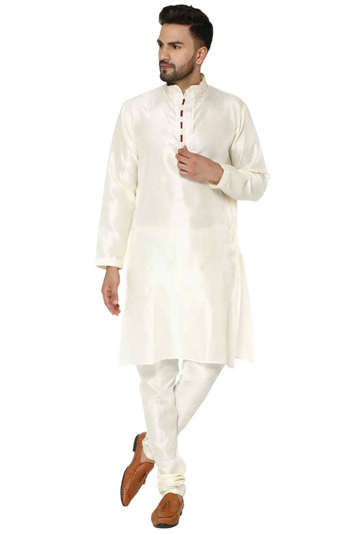 White Color Puja Wear Kurta Pyjama In Dhupion Silk Fabric