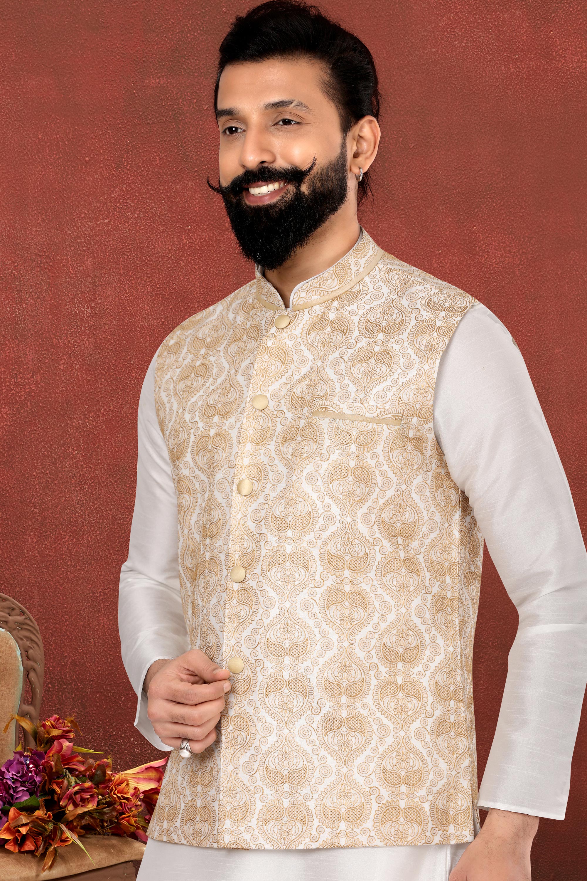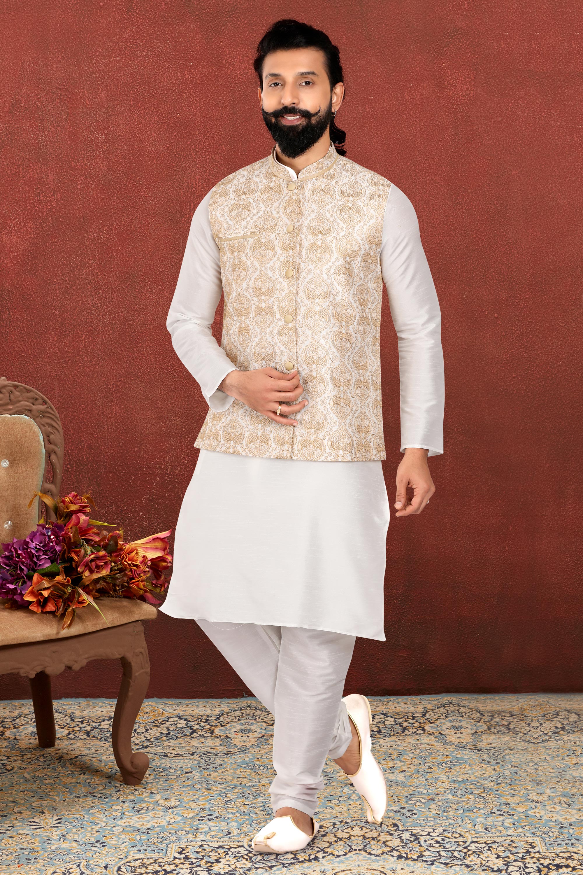 White Color Reception Wear Readymade Dhupion Silk Fabric Kurta Pyjama For Men With Jacket