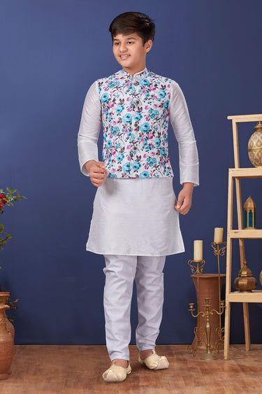 White Color Traditional Wear Dhupion Silk Fabric Readymade Boys Kurta Pyjama With Jacket