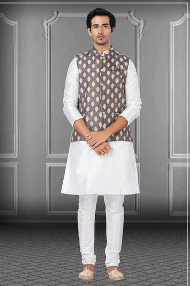 White Dhupion Raw Silk Fabric Festive Wear Captivating Readymade Kurta Pyjama For Men With Jacket
