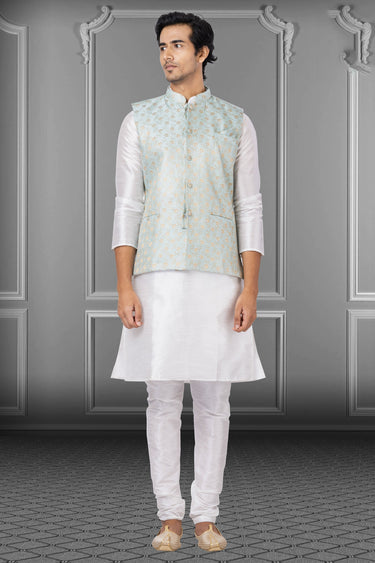 White Sangeet Wear Dhupion Raw Silk Fabric Designer Readymade Kurta Pyjama For Men With Jacket