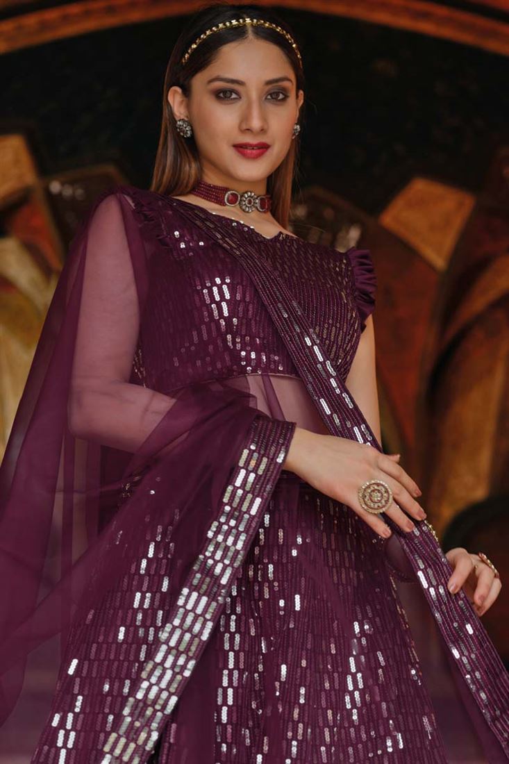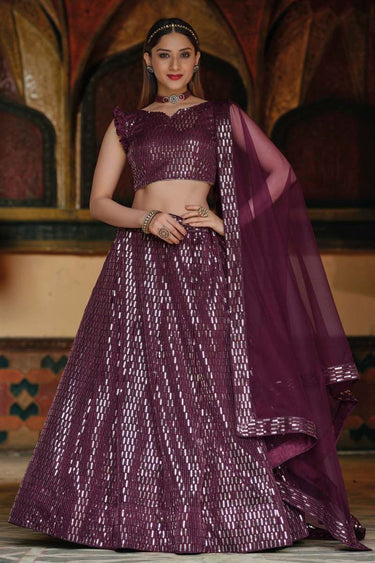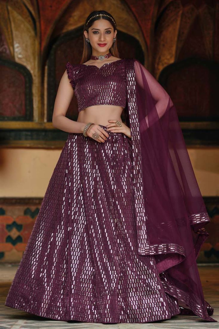 Wine Color Net Fabric Sangeet Wear Majestic Sequins Work Lehenga