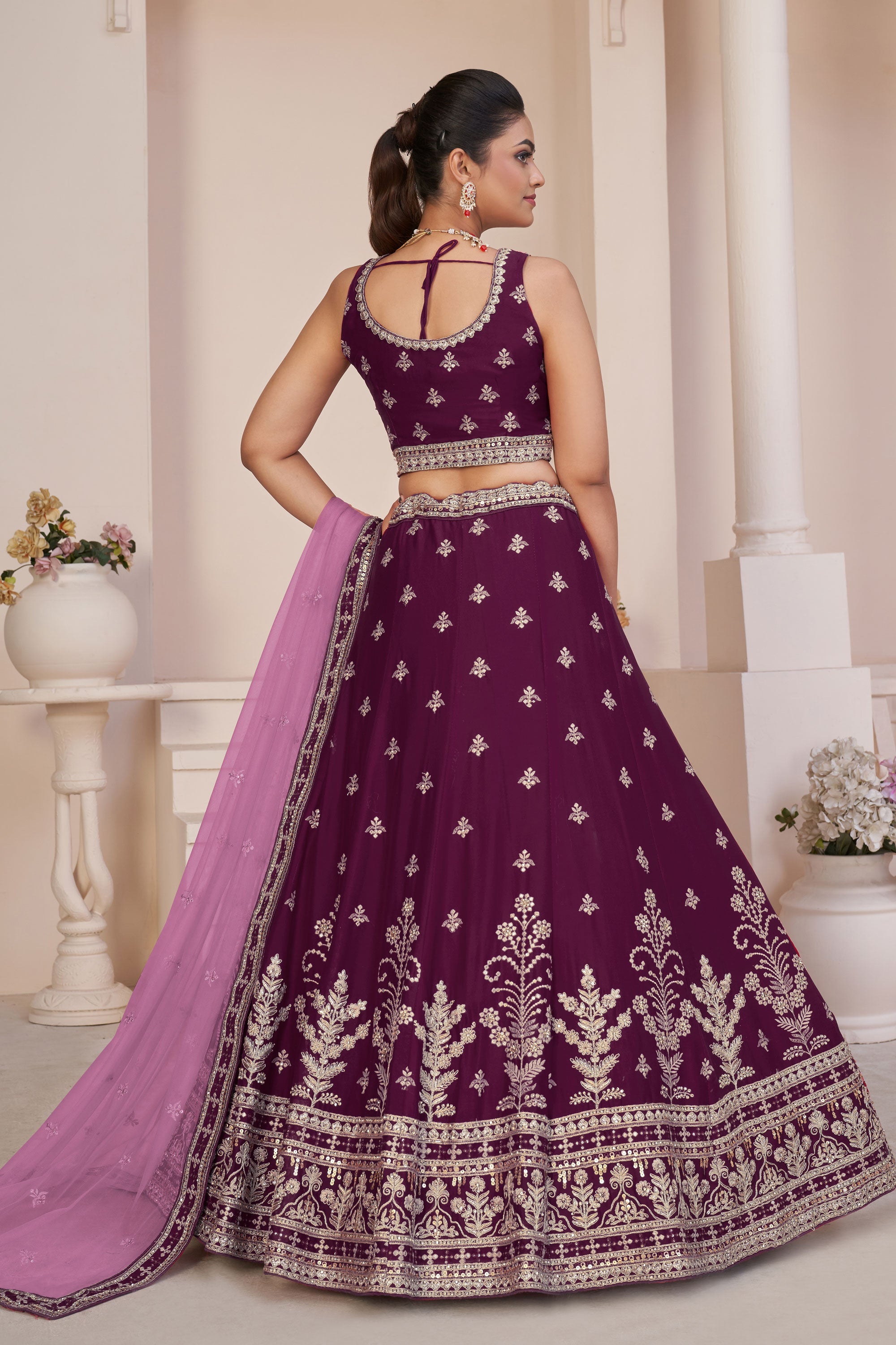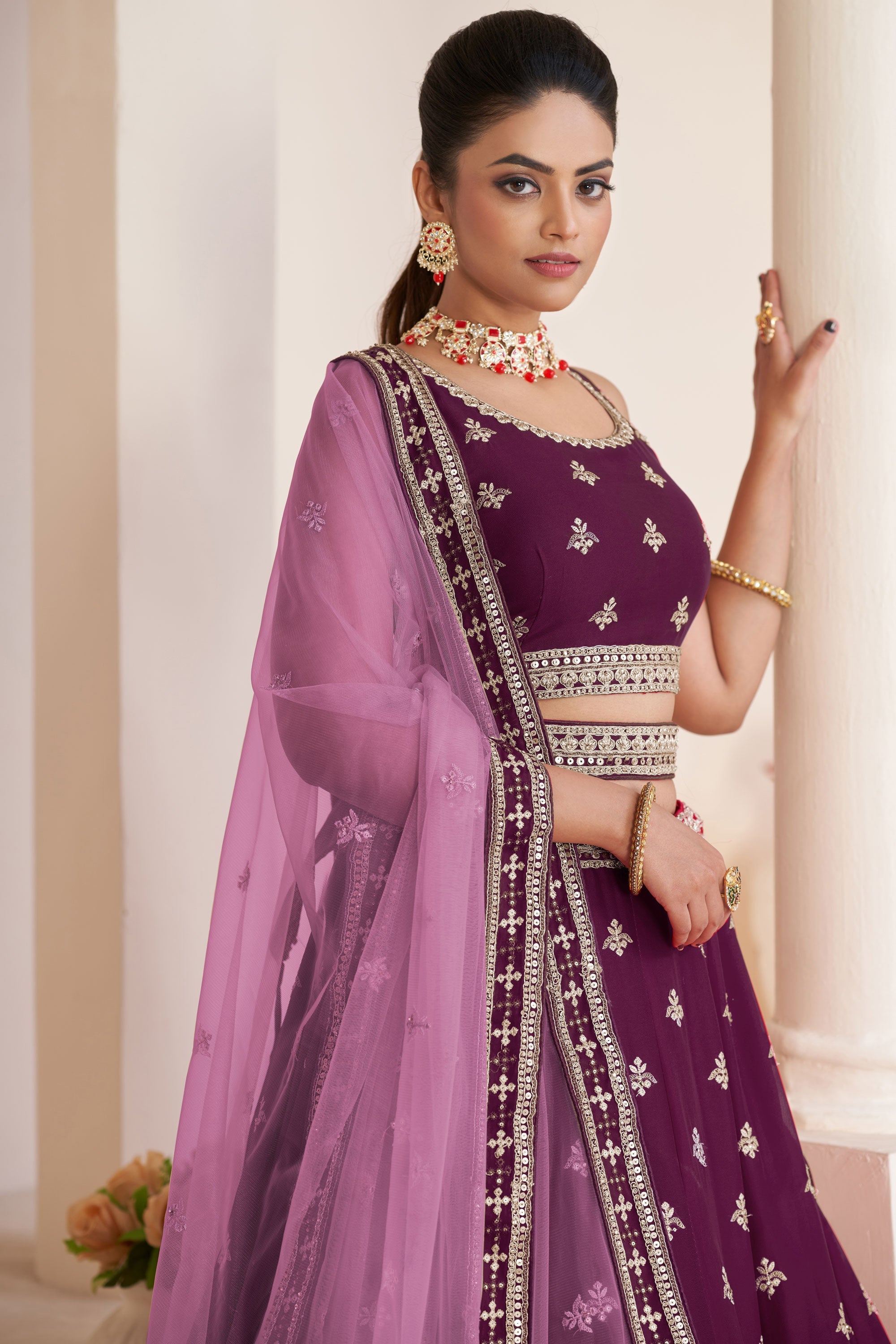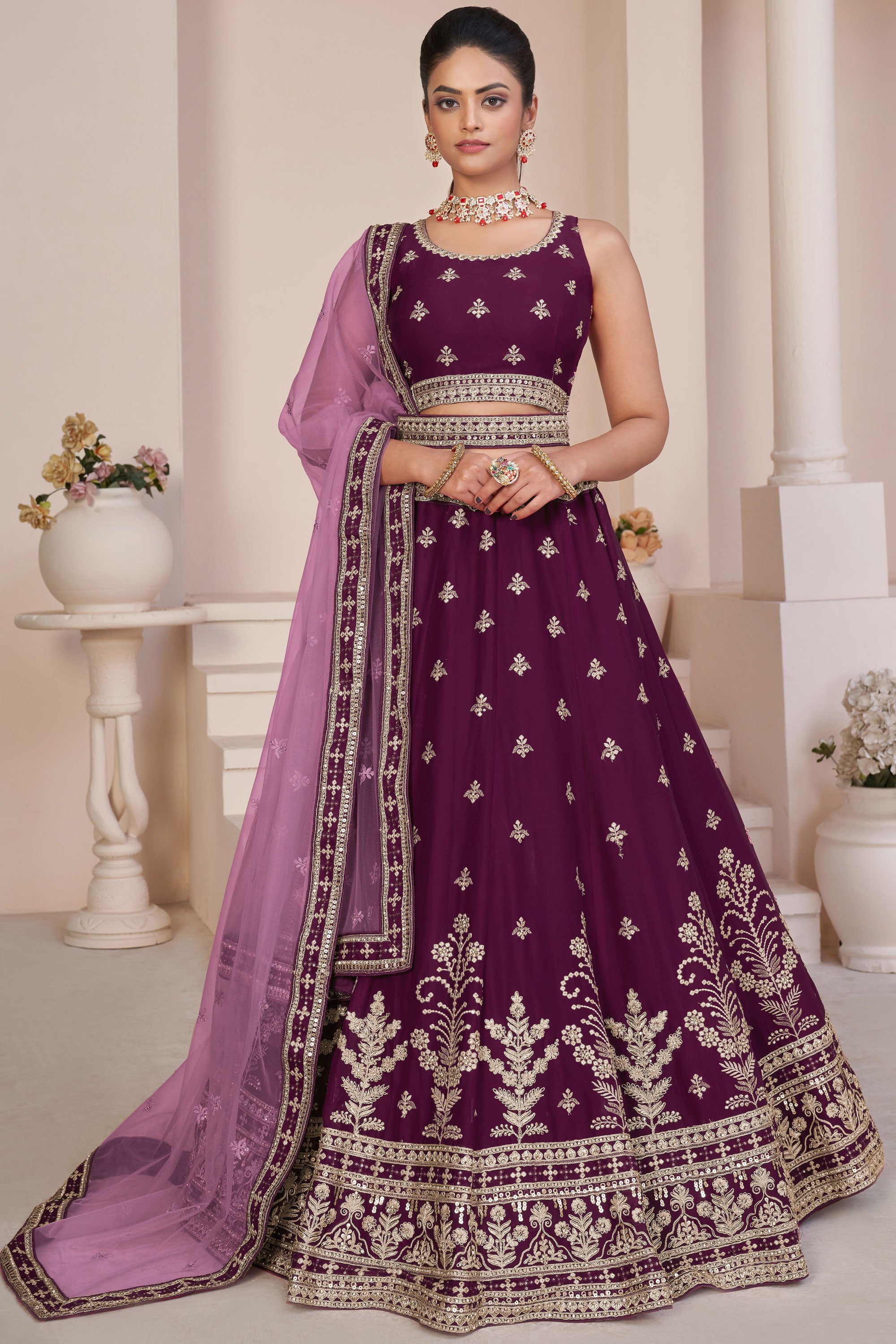 Wine Embroidered Georgette Wedding Wear Lehenga Choli