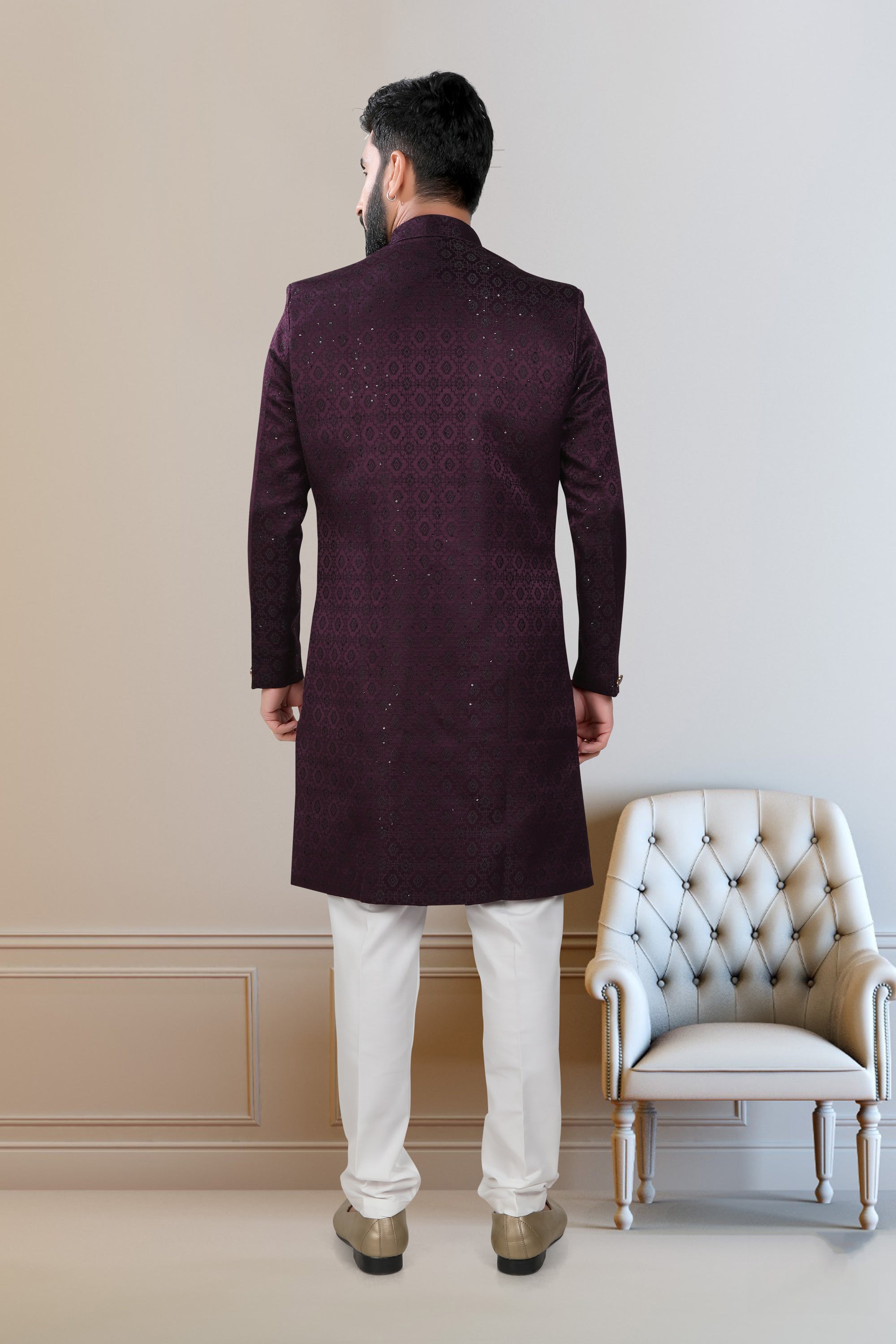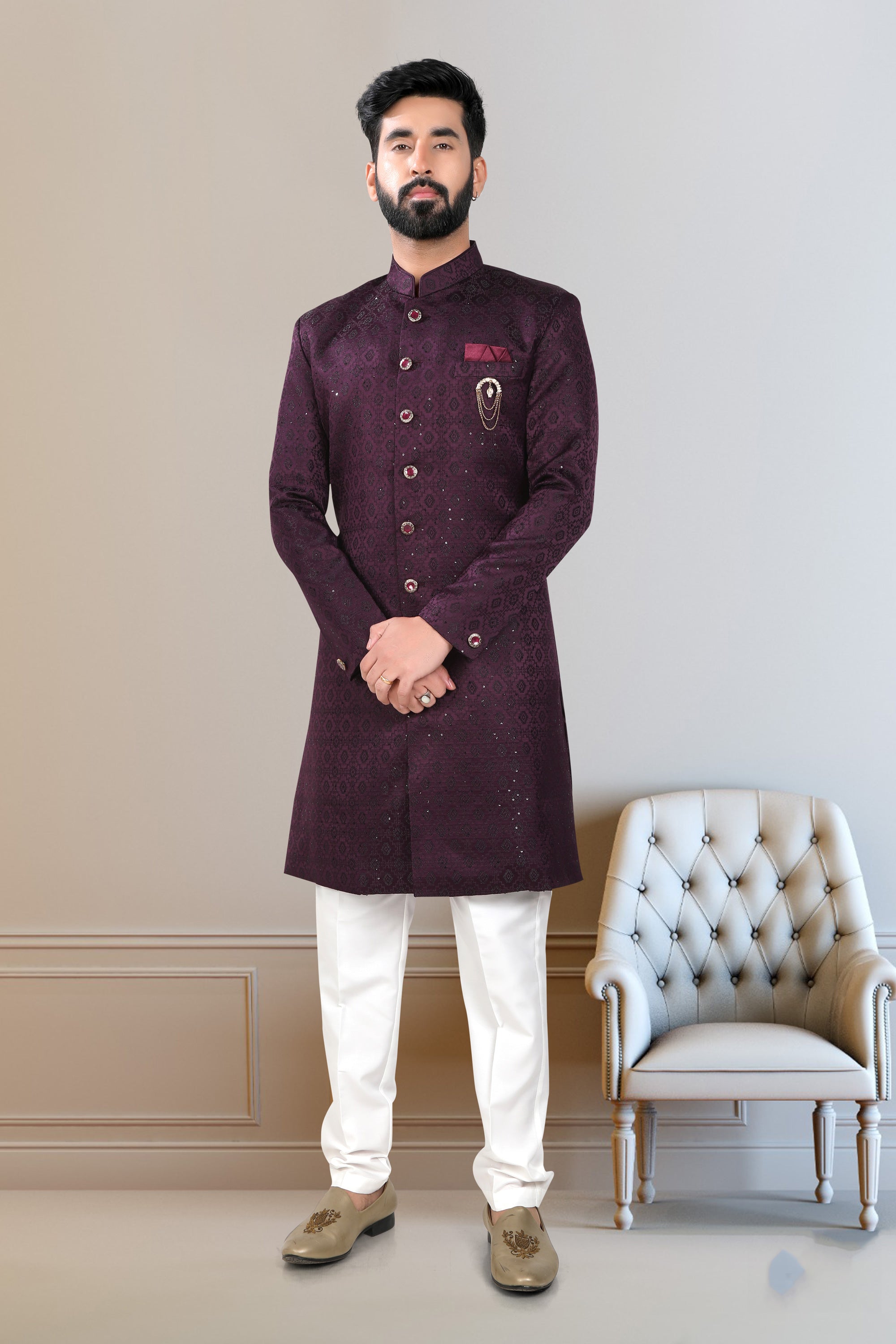 Wine Gorgeous Fancy Fabric Wedding Wear Readymade Indo Western For Men