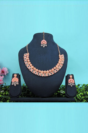 Winsome Alloy Material Pink Color Necklace Set Earrings And Mang Tikka For Women