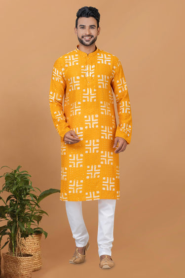 Yellow Chanderi Fabric Trendy Readymade Kurta Pyjama For Men