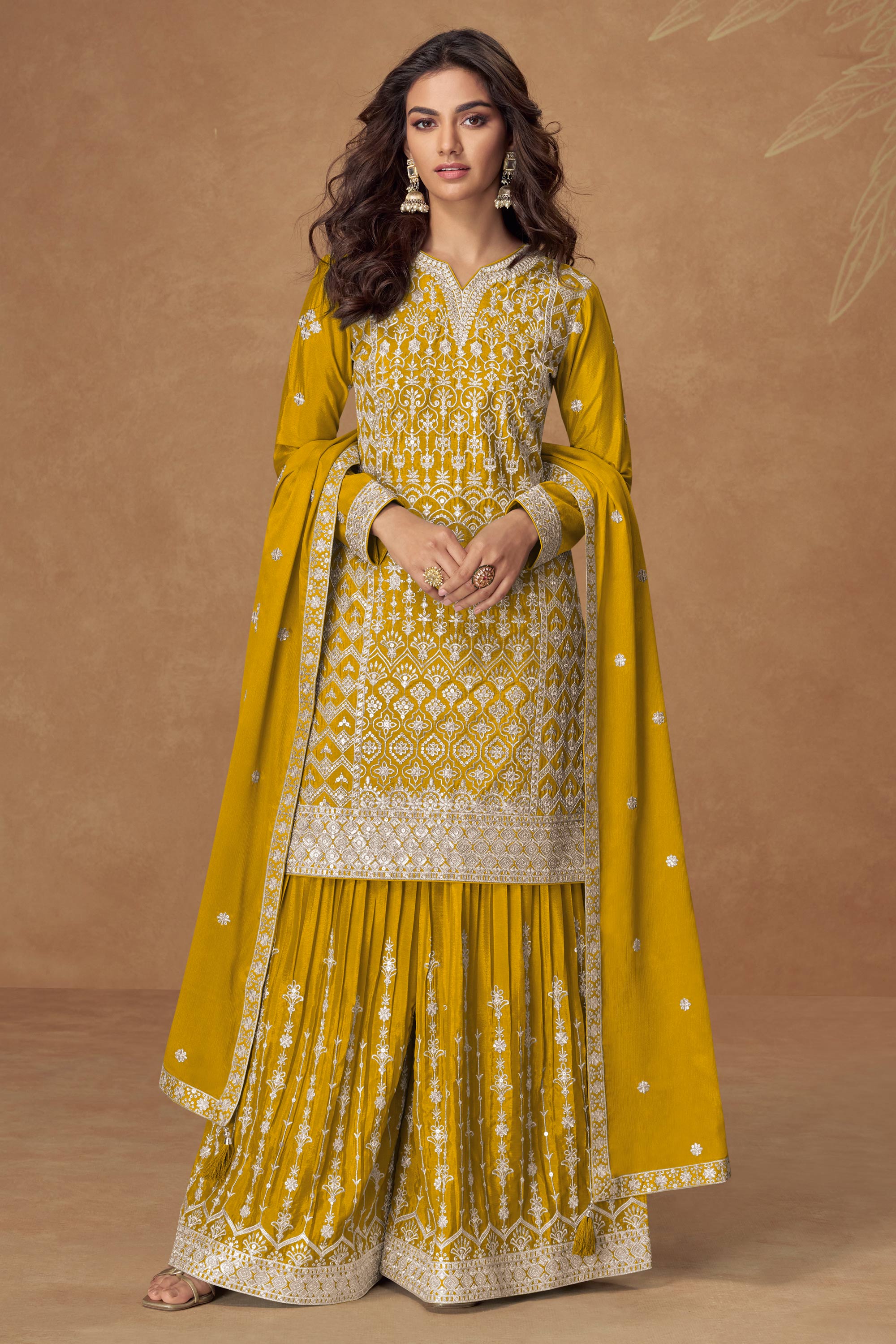 Yellow Chinon Silk Embroidered Readymade Palazzo Salwar Kameez
