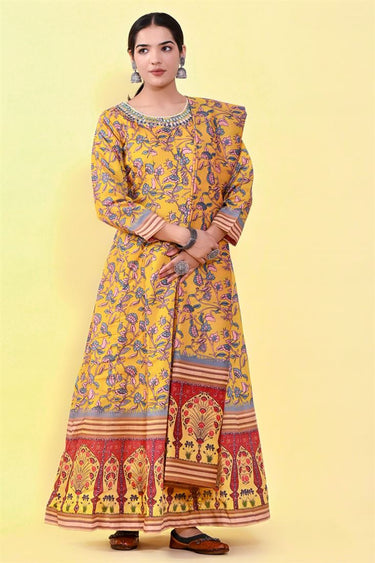 Yellow Color Art Silk Appealing kalamkari Printed Gown With Dupatta