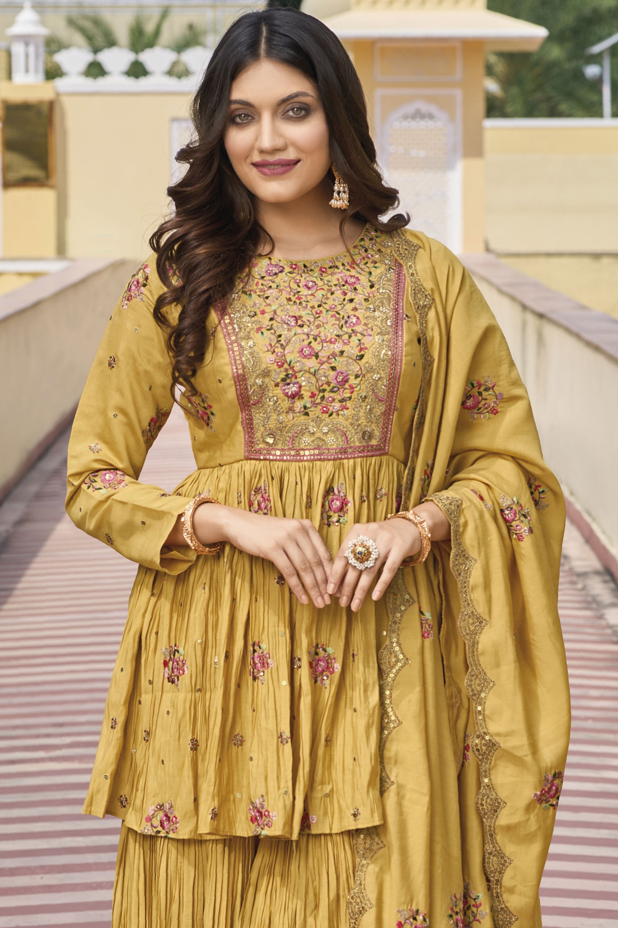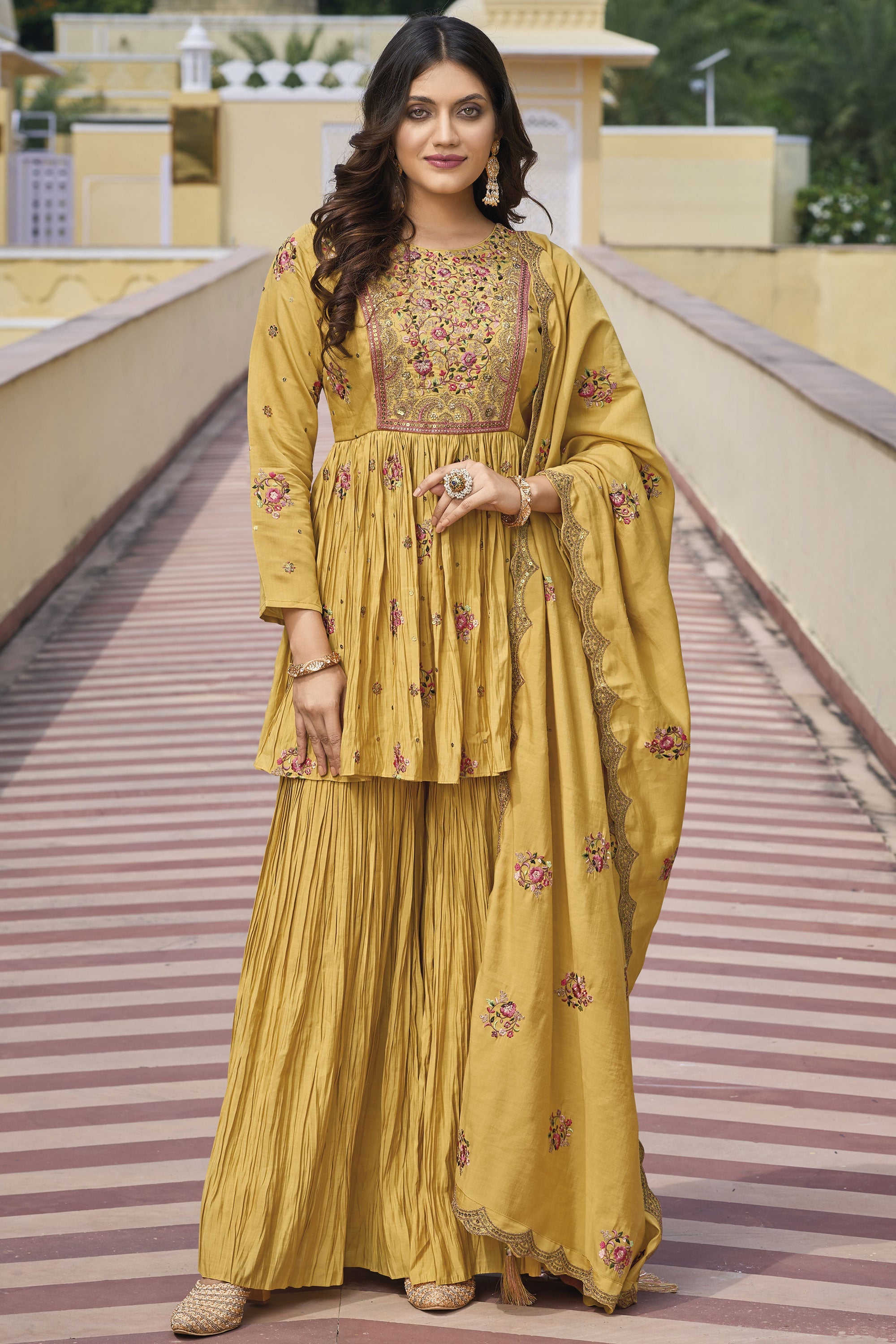 Yellow Color Art Silk Fabric Fancy Embroidered Readymade Designer Palazzo Salwar Suit