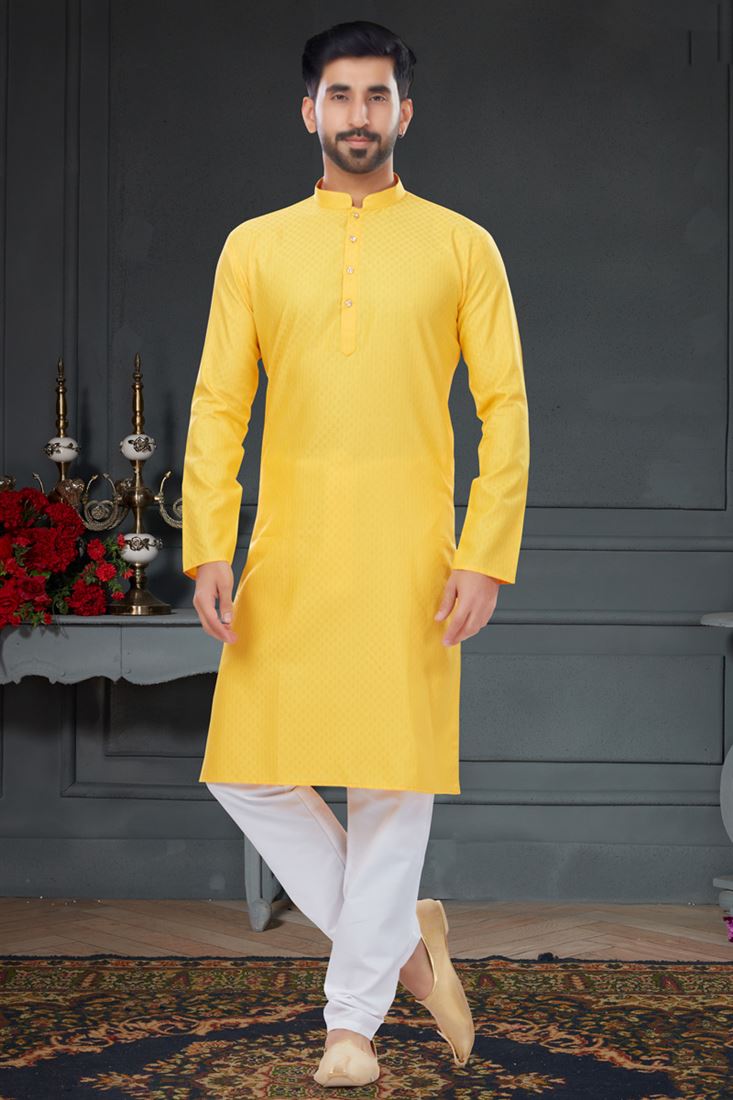 Yellow Color Cotton Kurta Pyjama In Jacquard Work