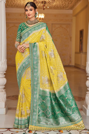 Yellow Color Dola Silk Fabric Sangeet Wear Weaving Work Saree