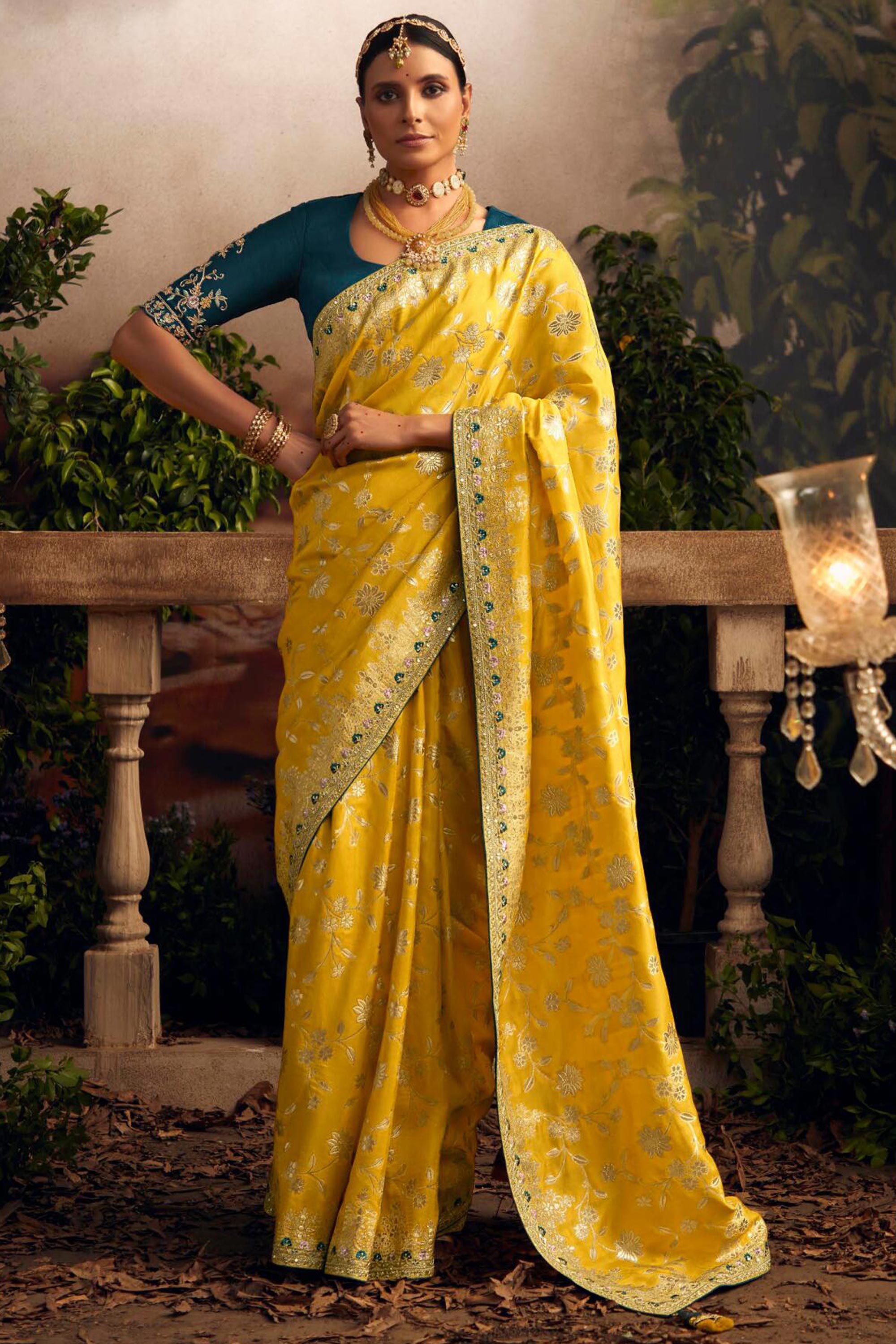 Yellow Color Dola Silk Fabric Weaving Work Saree With Contrast Blouse
