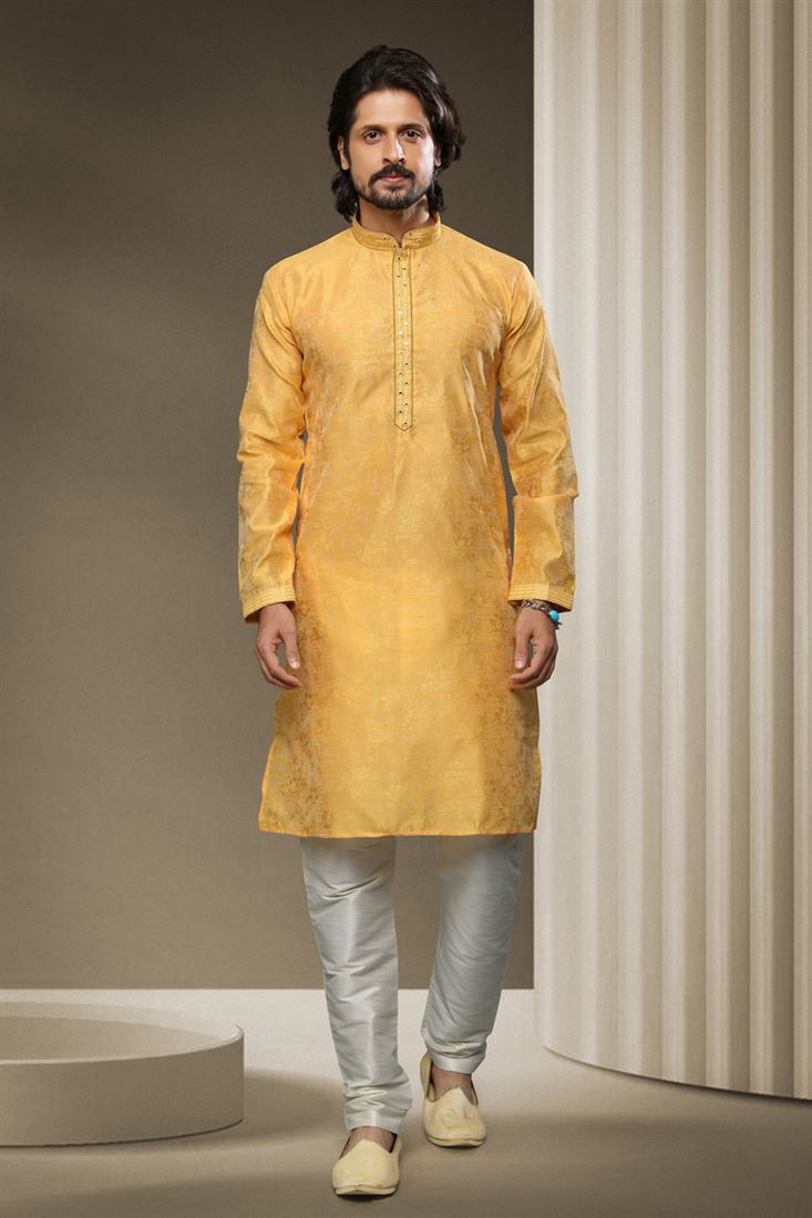 Yellow Color Jacquard Silk Fabric Function Wear Readymade Kurta Pyjama For Men