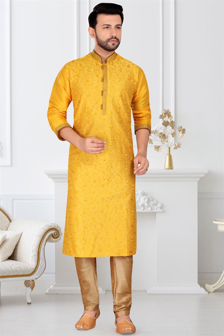 Yellow Color Silk Fabric Sangeet Wear Readymade Designer Mens Kurta Pyjama