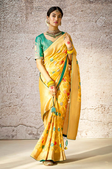 Discover timeless elegance with the Kora Banarasi Saree, a masterpiece adorned with delicate floral patterns. Intertwined foliage shapes crafted from zari and silk threads come together in an expertly woven tapestry of dazzling light and color. Paired with a Banarasi Silk Blouse featuring heavy embroidery and intricate handwork, this ensemble is perfect for weddings, festivals, and special occasions. Feel regal in a garment that seamlessly combines tradition and contemporary style.